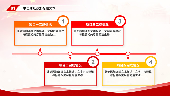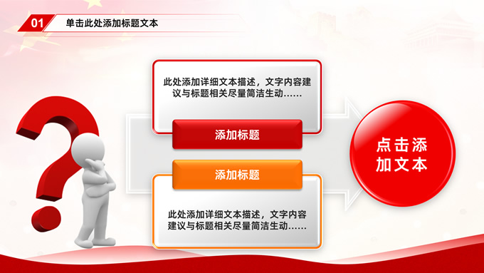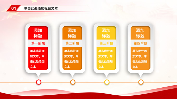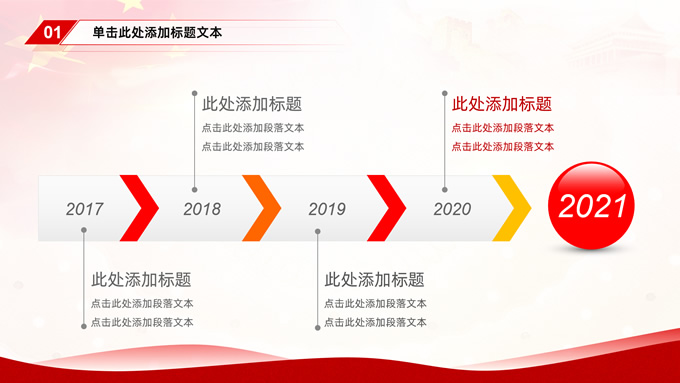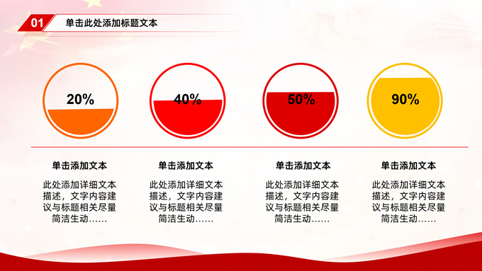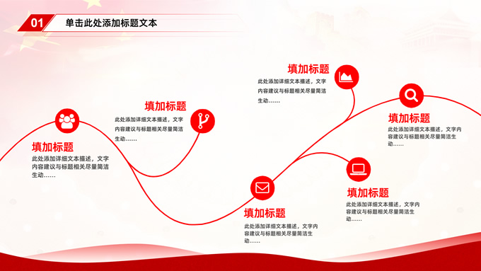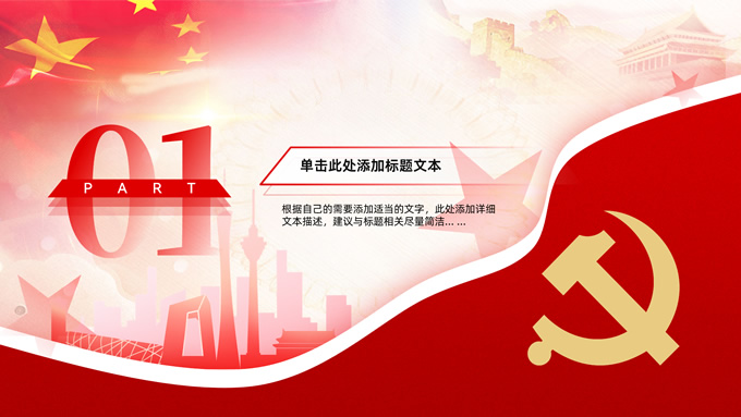简介:简约大气党建工作汇报通用型ppt模板,本模板共35P,党徽、国旗、万里长城、国内大城市剪影、五角星等元素创意封面、目录页、过渡页,中国红配色,简约大气版式内容页,适合工作汇报、党课课件等场景应用的党建类通用型ppt模板。