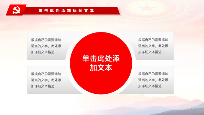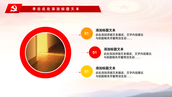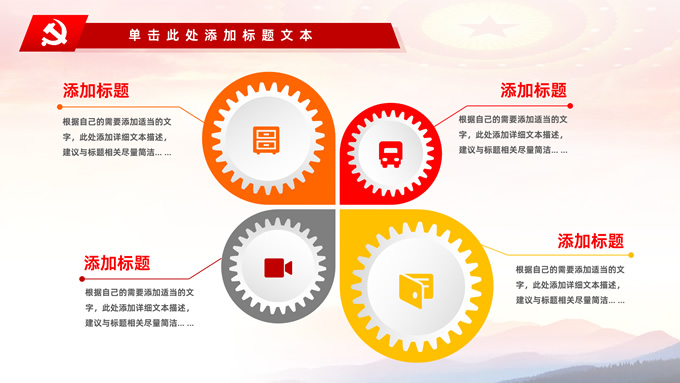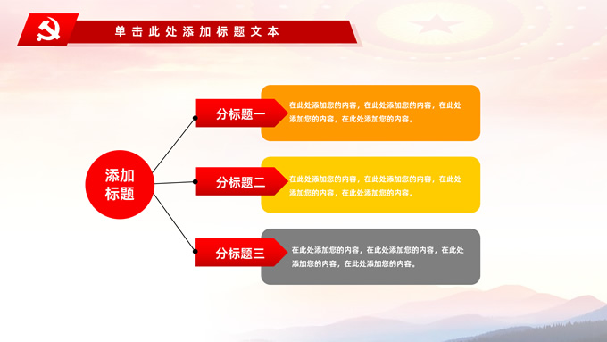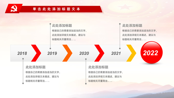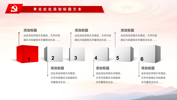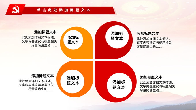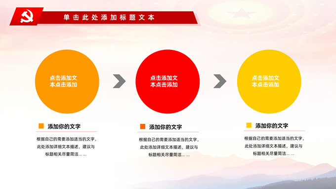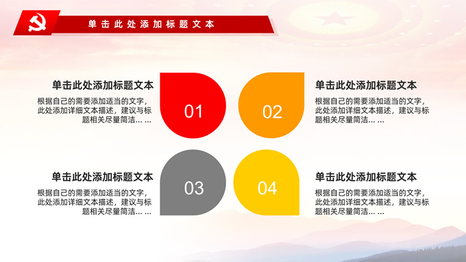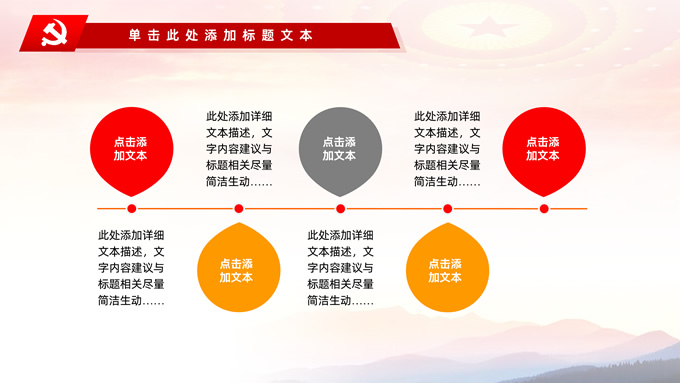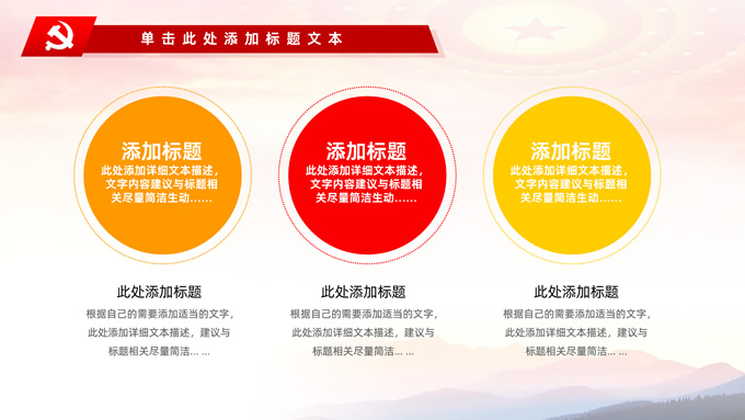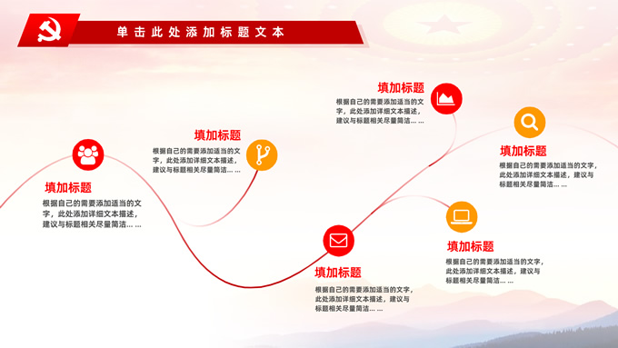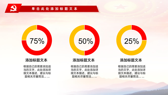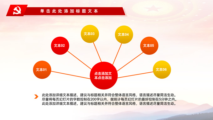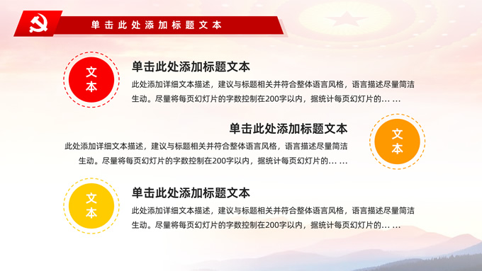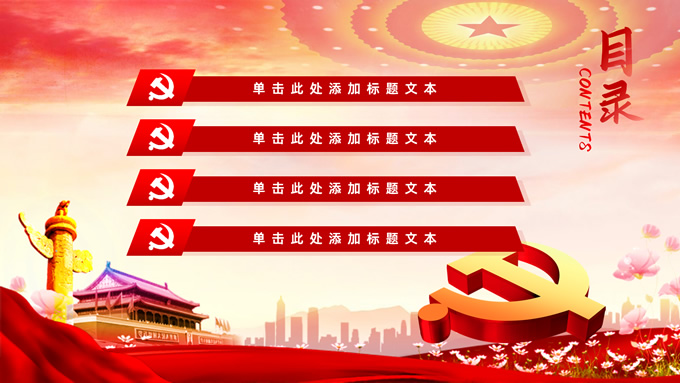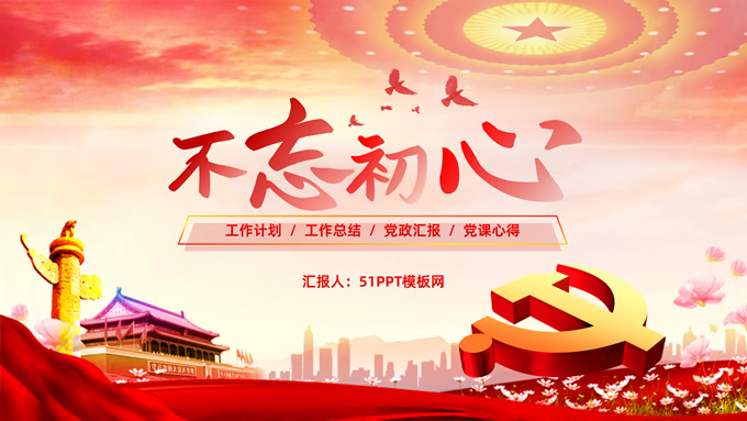 简介:不忘初心——简约实用党建工作汇报通用型ppt模板,本模板共29P,金色立体党徽、人民大会堂顶灯、天安门、华表、不忘初心创意字体、城市剪影、飘带、花朵等元素创意设计封面、目录页、过渡页,庄严中国红配色,扁平化图表,大气简约版式内容页,适合党建工作汇报、党课学习心得、党课课件等场景应用的党建工作通用型ppt模板。