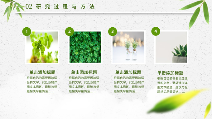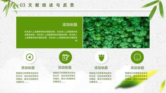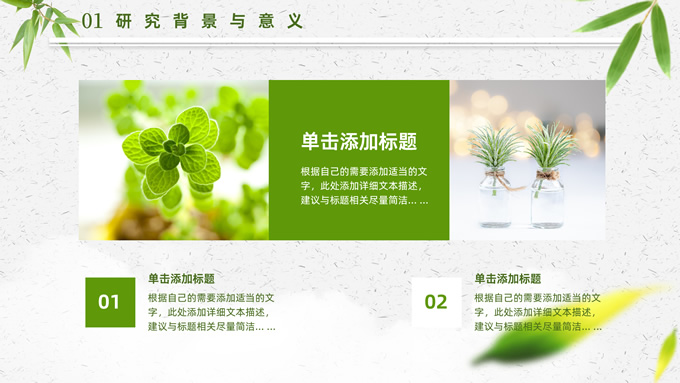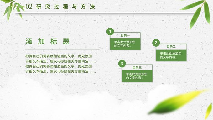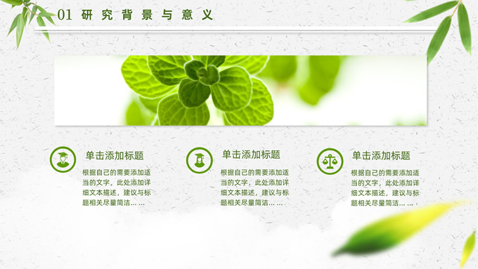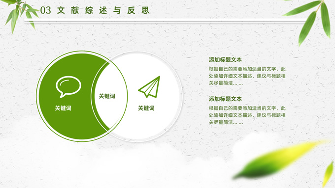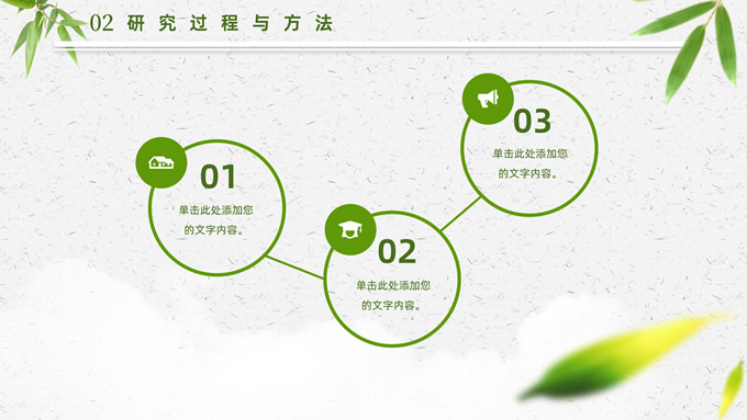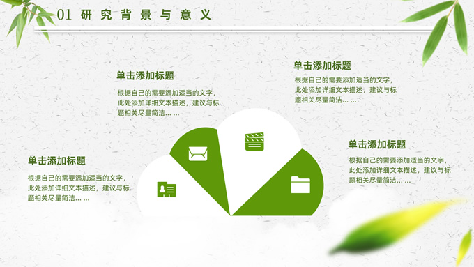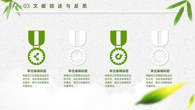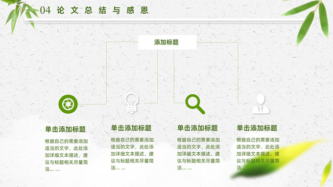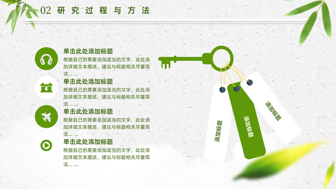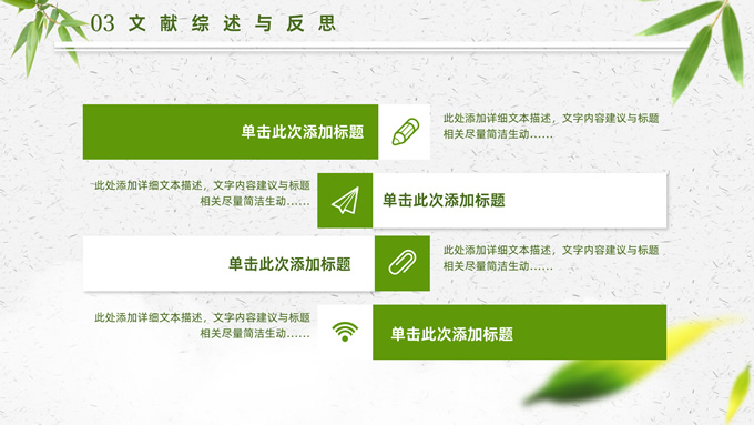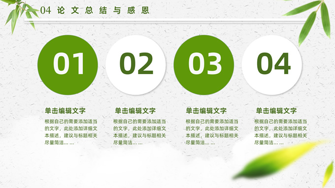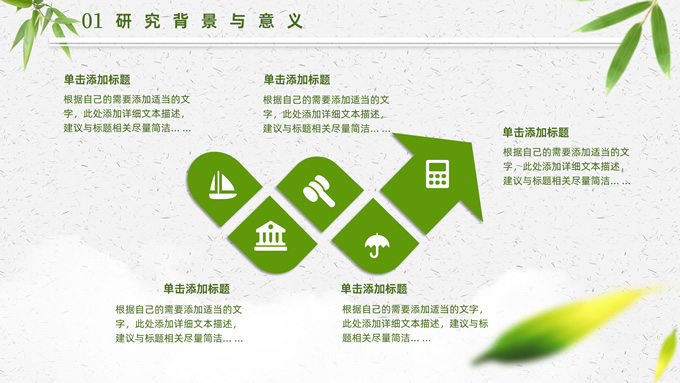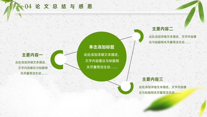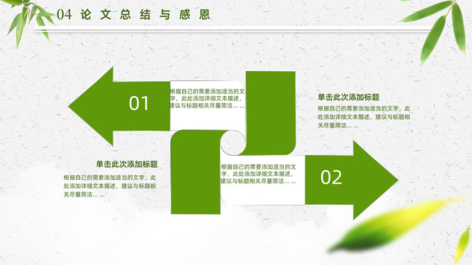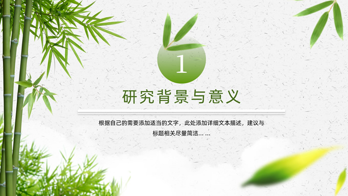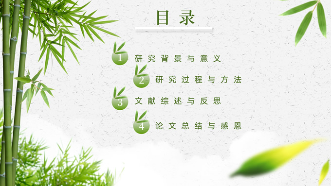 简介:绿竹清新文艺风论文答辩ppt模板,本模板共25P,目录:研究背景与意义、研究过程与方法、文献综述与反思、论文总结与感恩,糙纸背景,竹、竹叶主图阴影风格几何框标题文字创意封面、目录页、过渡页,绿白小清新配色,阴影风格图表,适合论文答辩、学生总结、学术汇报、工作总结等场景应用的论文答辩通用ppt模板。