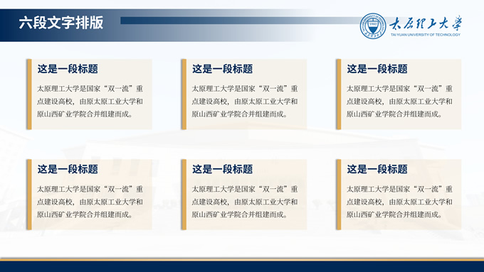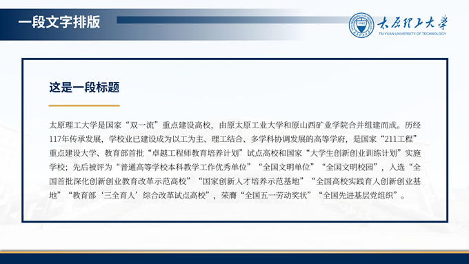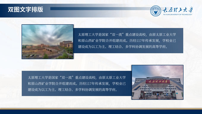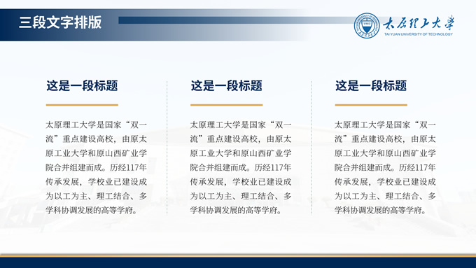 简介:3套设计方案高校毕业答辩通用ppt模板,本模板共49P,是一份关于高校答辩的PPT模板,整体的风格是蓝色商务风,取色来源于太原理工大学学校LOGO,其中包含了封面页、封底页、目录页、过渡页、内容页,支持一键替换字体、替换颜色、编辑图表数据等,是一份好用、好看的PPT模板,P界达人 十三 作品。