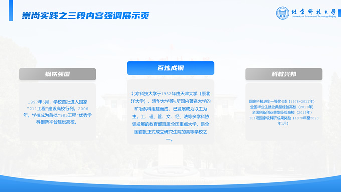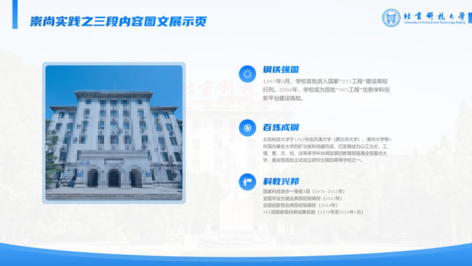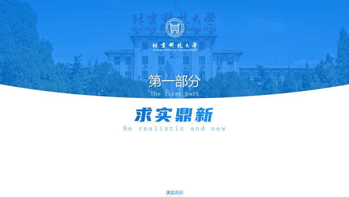 简介:北京科技大学学生总结汇报答辩通用ppt模板,本模板共15P,这份作品是北京科技大学官方PPT模板之一,第一期全部版本有7套(均由我一人设计),受到北京科技大学官方推文推荐,现已经成为北京科技大学传播最广应用最为广泛的PPT模板之一,设计来源参考国内多部优秀高校PPT模板作品!P界达人 王奕博 作品。