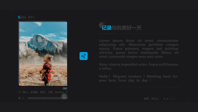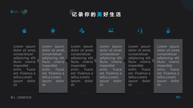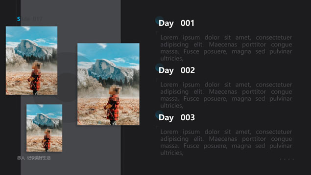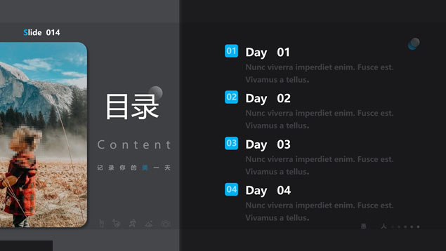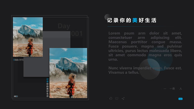 简介:开始记录美好生活——暗色高级感相册ppt模板,本模板共9P,创意图片排版几何图形标题文字创意封面,高级感几何图形几何风图文版式内容页,酷黑蓝配色,适合个人成长记录、生活相册等场景应用的相册ppt模板。