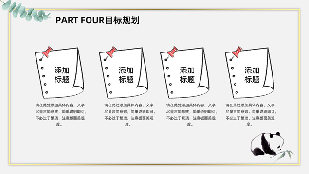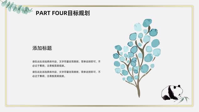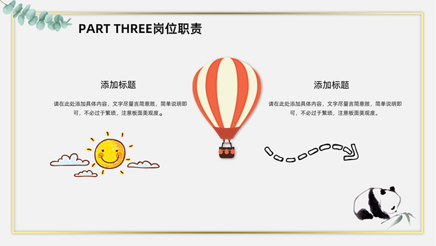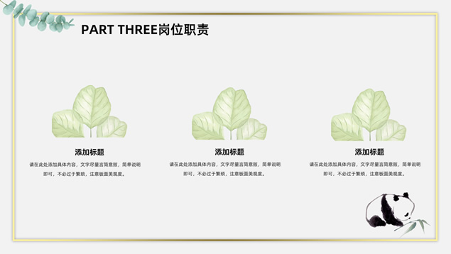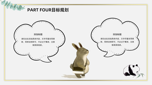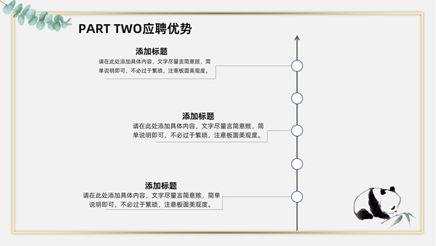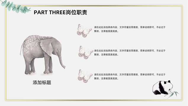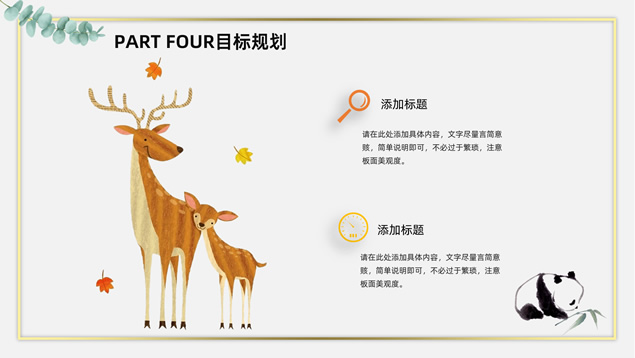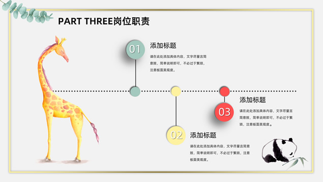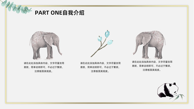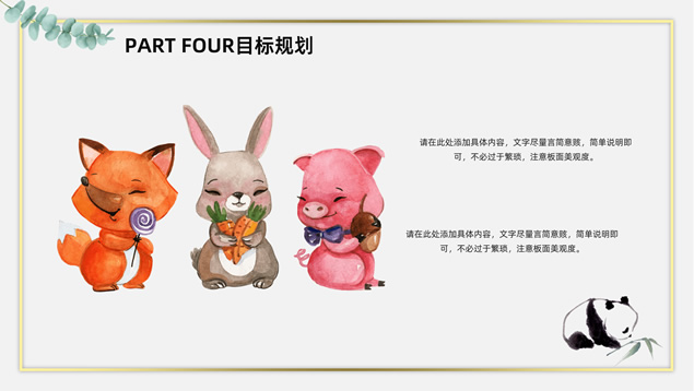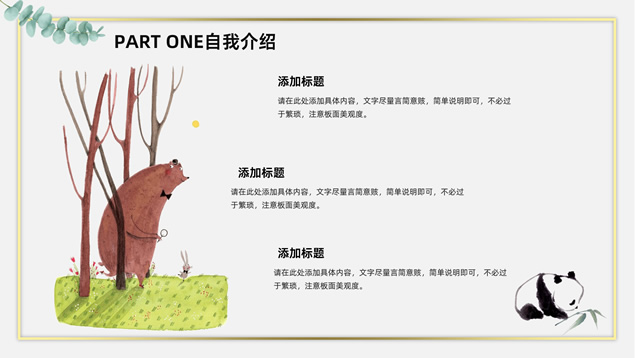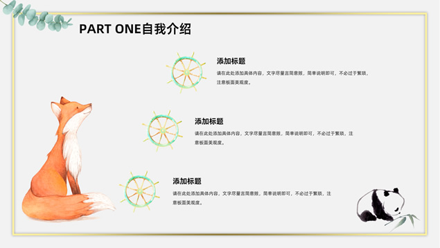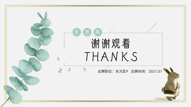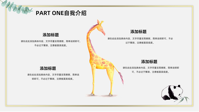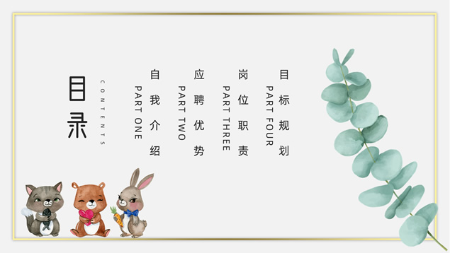 简介:淡雅水彩文艺风个人求职应聘ppt模板,本模板共25P,目录:自我介绍、应聘优势、岗位职责、目标规划,淡雅灰渐变金色框背景,水彩叶子主图几何线条简约封面,可爱卡通动物配图,简约清新风版式内容页,适合个人求职应聘、个人总结汇报等场景应用的文艺风ppt模板。