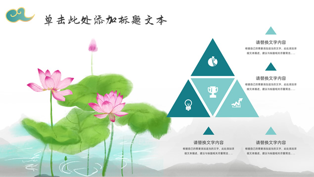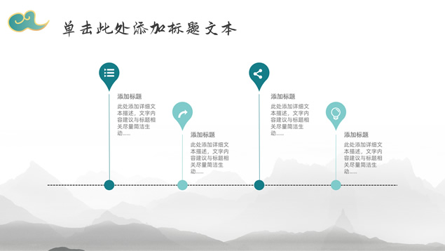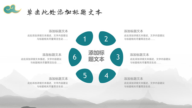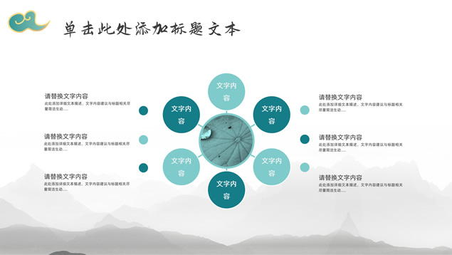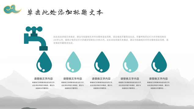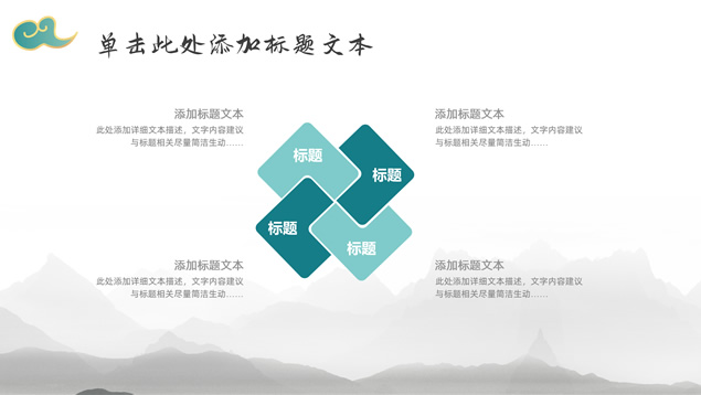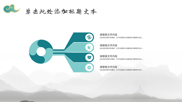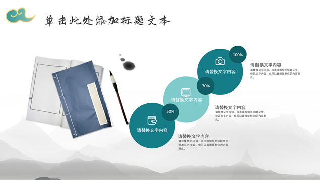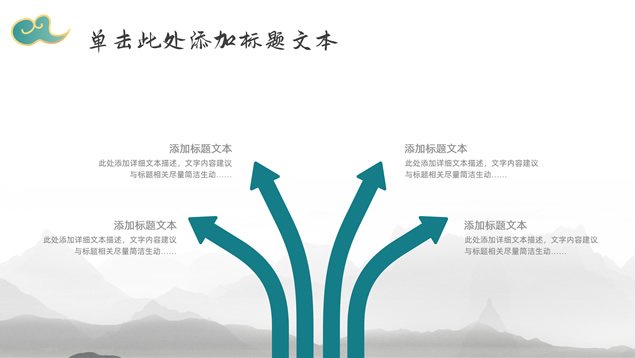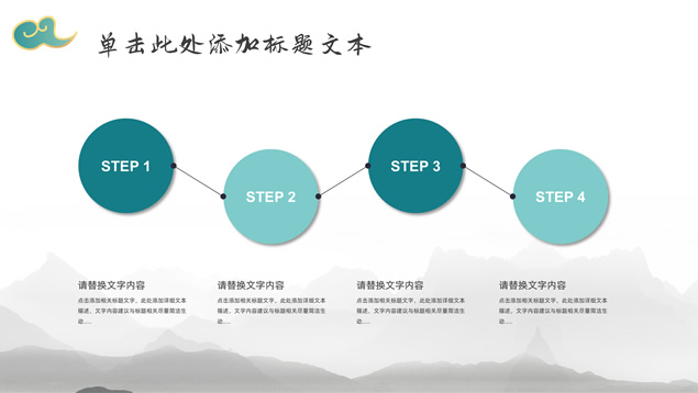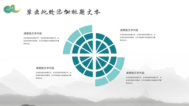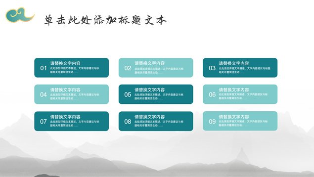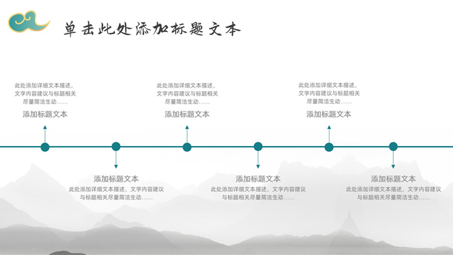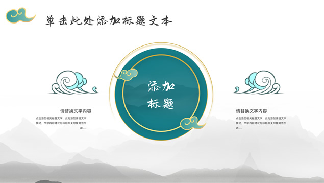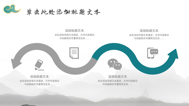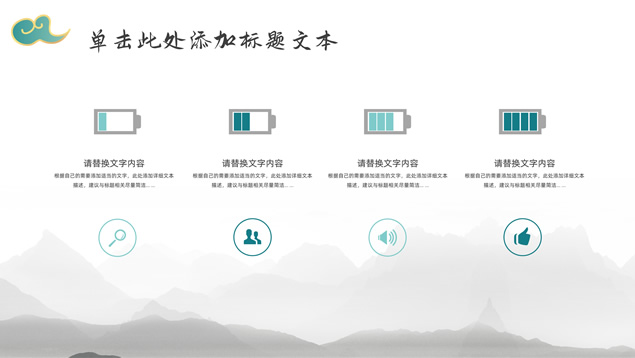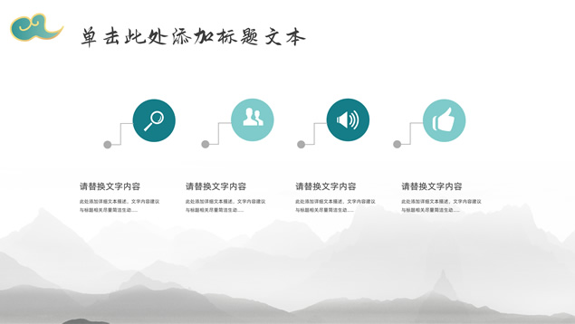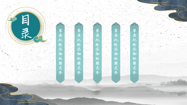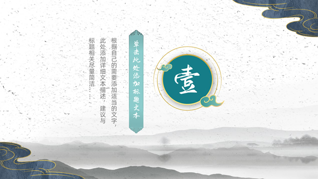 简介:简约大气国潮中国风工作汇报ppt模板,本模板共22P,淡雅灰水墨山川背景,祥云、仙鹤、红印章、金边圆环、古典边框创意设计封面、目录页、过渡页,墨绿小清新配色,简约扁平化图表,适合工作总结、工作汇报等场景应用的国潮中国风ppt模板。