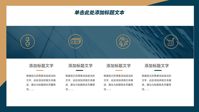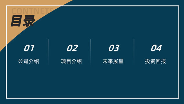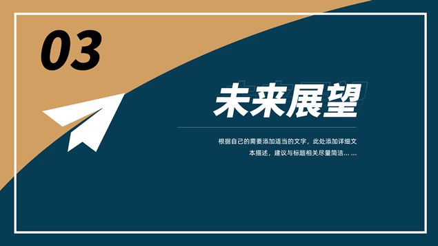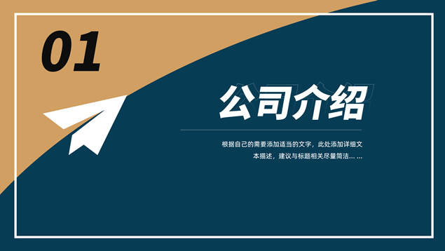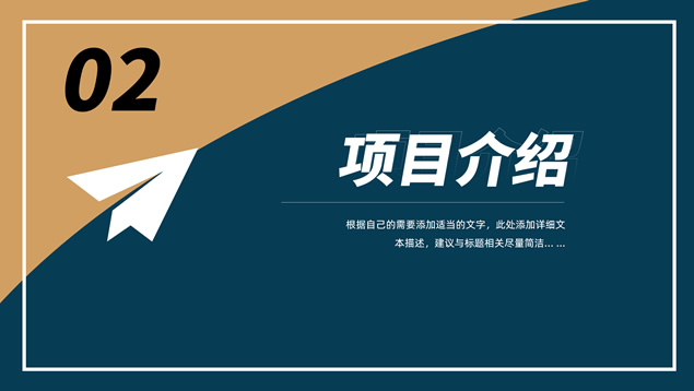 简介:简约大气几何风商业计划书ppt模板,本模板共23P,目录:公司介绍、项目介绍、未来展望、投资回报,弧形、几何框、纸飞机、标题文字创意封面、目录页、过渡页,扁平化图表,高端蓝金配色,适合计划书、项目书、项目汇报、企业介绍、工作总结等场景应用的计划书通用ppt模板。