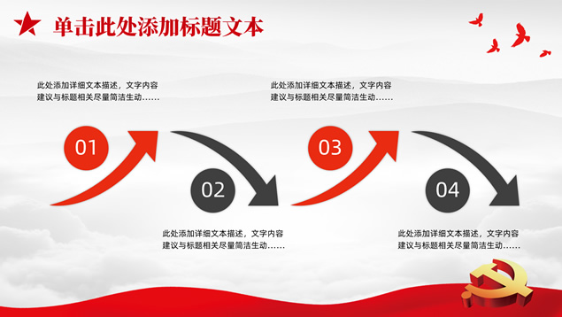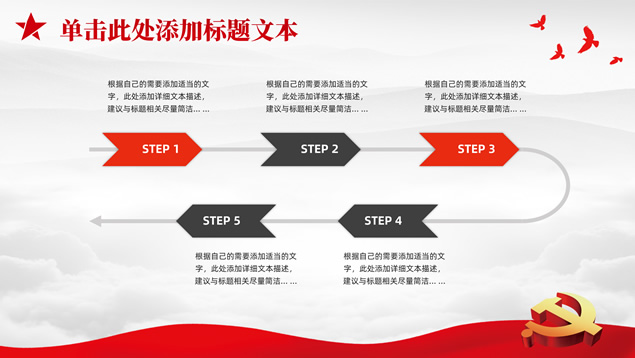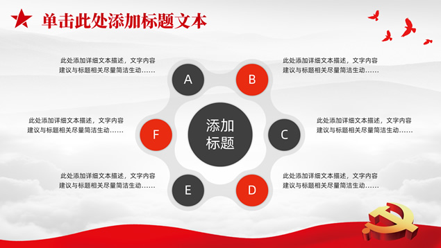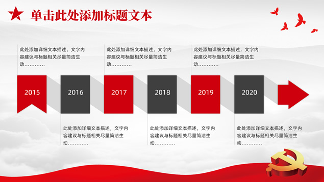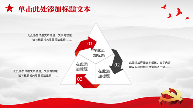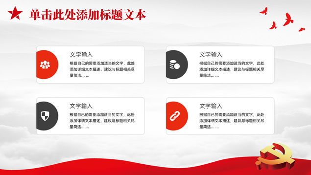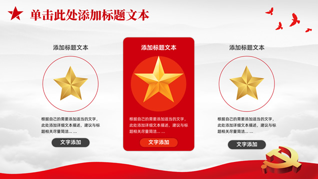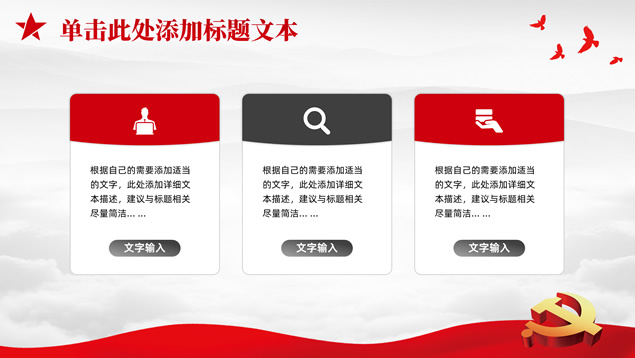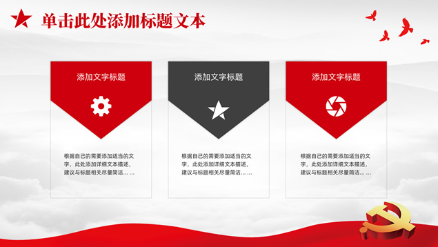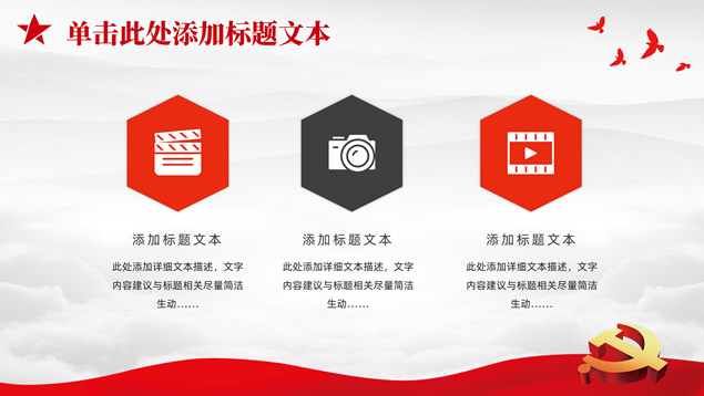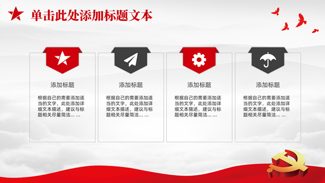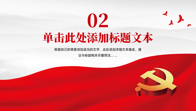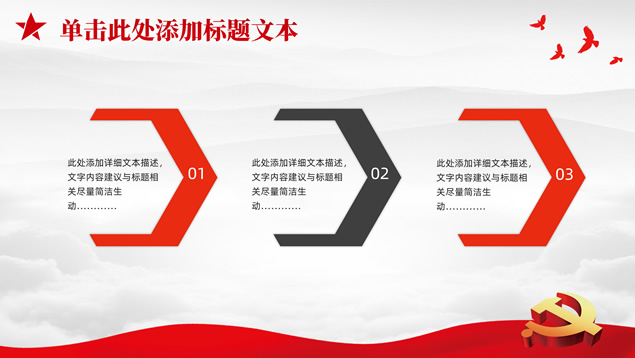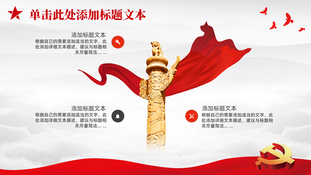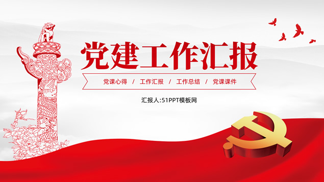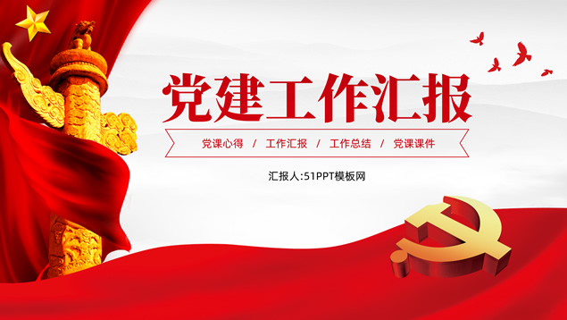 简介:庄严简约大气党建工作汇报通用ppt模板,本模板共25P,淡雅灰山川背景,金色立体党徽、华表、五角星、和平鸽等党政风素材创意封面、目录页、过渡页,庄严红配色,扁平化图表,简约大气版式,适合党课心得、党课课件、工作汇报、工作总结等场景应用的庄严党建总结汇报通用ppt模板。