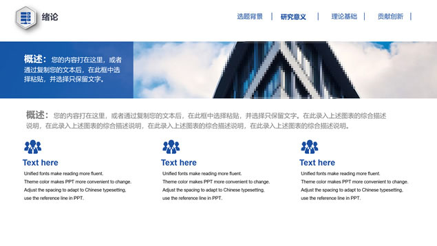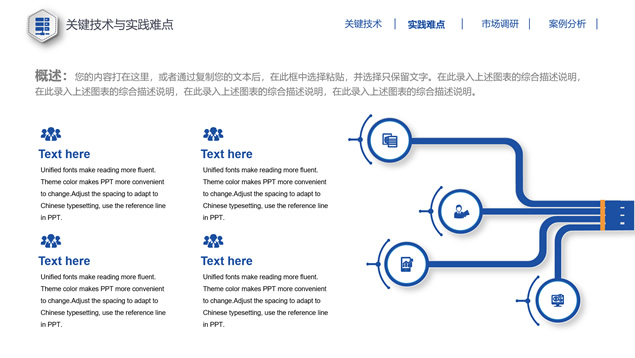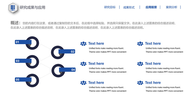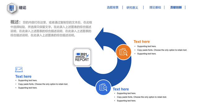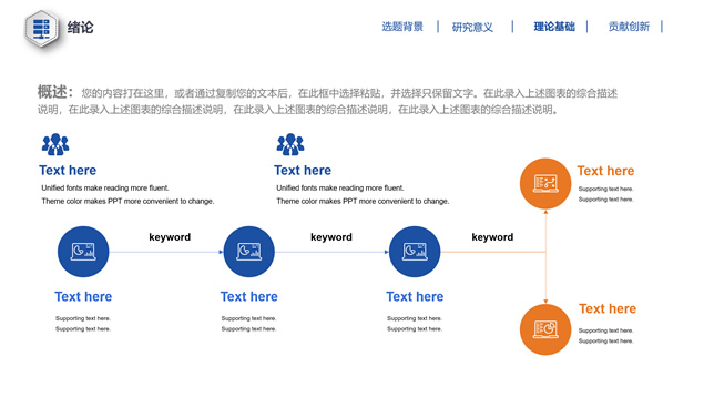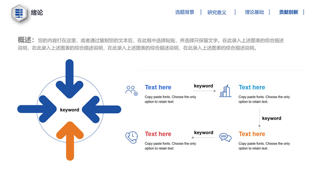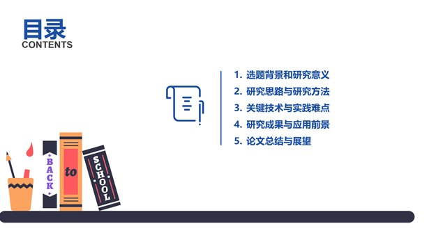 简介:流体几何简约卡通学术蓝论文答辩通用ppt模板,本模板共32P,目录:1、选题背景和研究意义;2、研究思路与研究方法;3、关键技术与实践难点;4、研究成果与应用前景;5、论文总结与展望,卡通书籍等学习用具流体几何创意封面、目录页、过渡页,仿网页导航简约版式内容页,学术蓝配色,扁平化图表,适合论文答辩、毕业汇报等场景应用的答辩通用ppt模板。