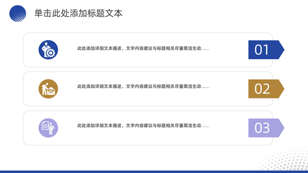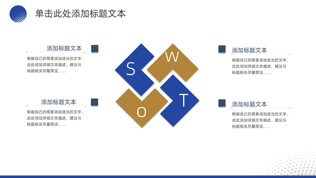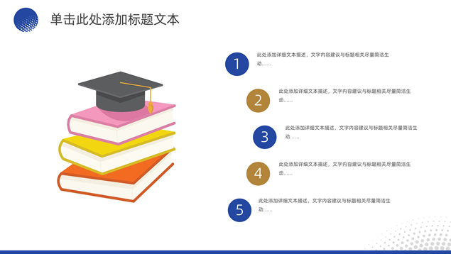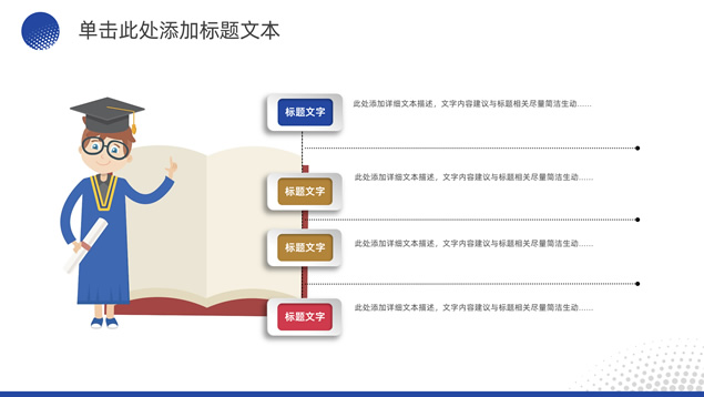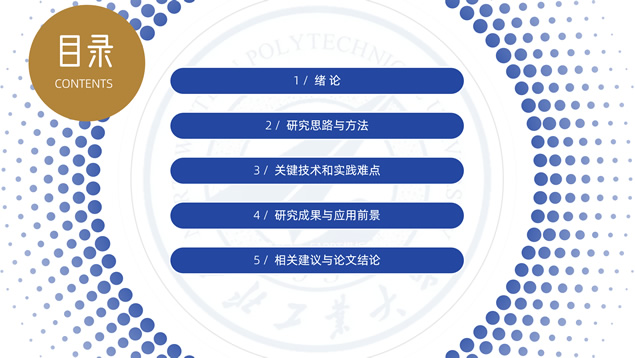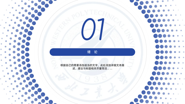 简介:西北工业大学论文答辩通用ppt模板,本模板共23P,圆点点阵创意背景,校徽、圆圈几何风标题文字设计封面、目录页、过渡页,学术蓝配色,扁平化图表,教育教学卡通风元素素材配图,适合论文答辩、毕业汇报等场景应用的答辩通用ppt模板。
