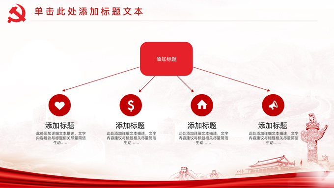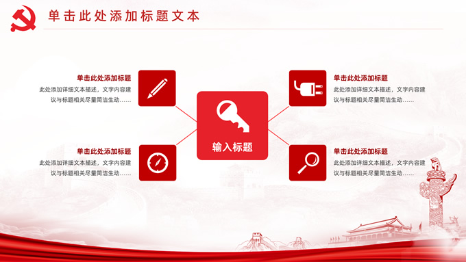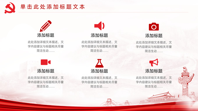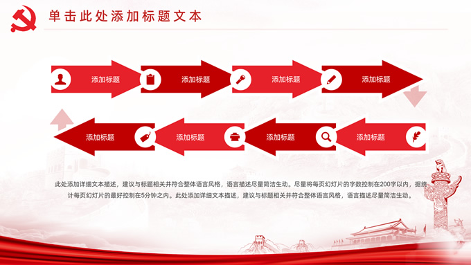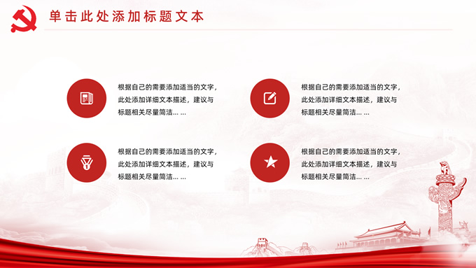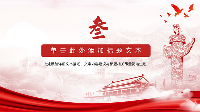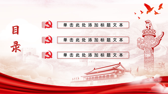 简介:与时俱进 为党争先——简洁大气党建汇报通用ppt模板,本模板共28P,党徽、国旗、和平鸽、华表、天安门、绸带、五角星党政风元素素材,淡雅灰万里长城背景,庄严红配色,扁平化图表,适合党建工作汇报、党课学习心得等场景应用的党政风ppt模板。