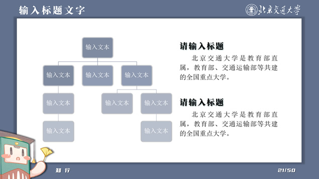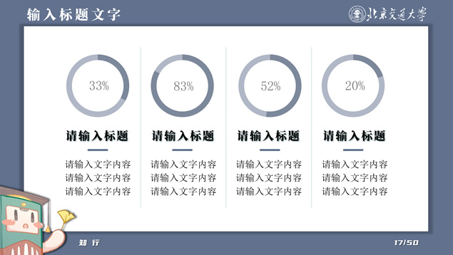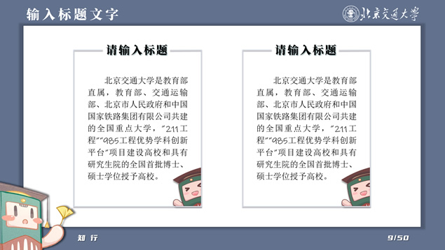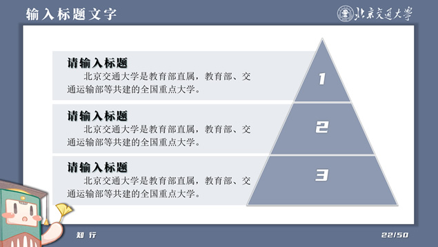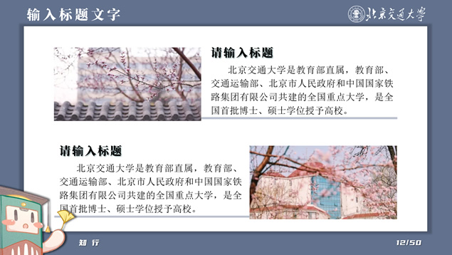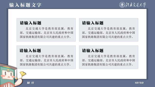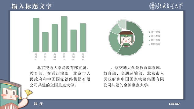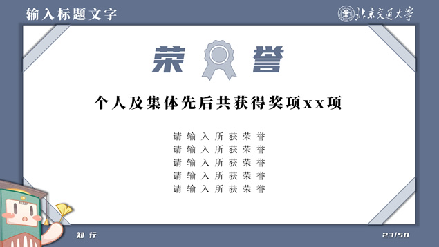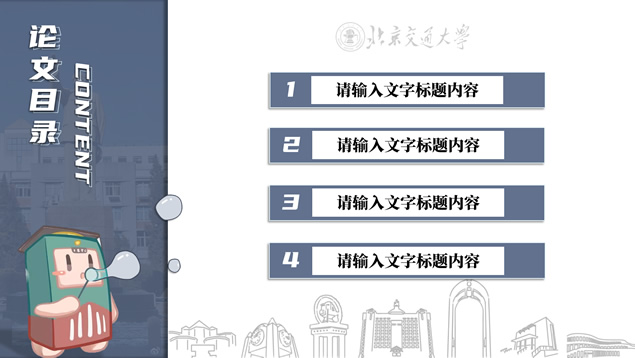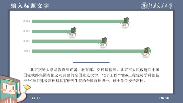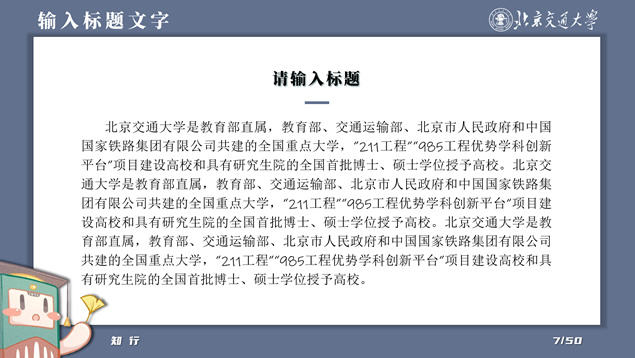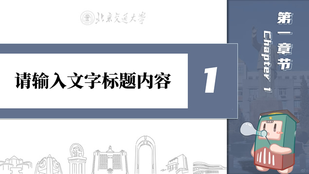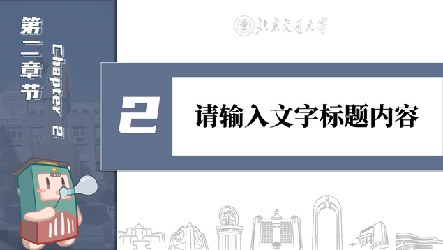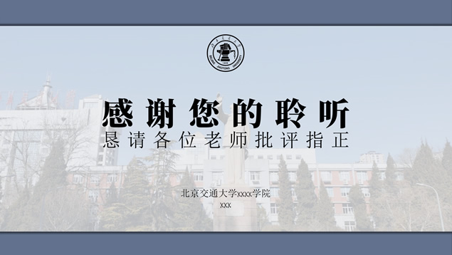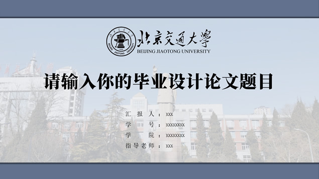 简介:北京交通大学团日汇报个人答辩通用ppt模板,本模板共30P,北京交通大学校徽、校园风光大图标题文字创意设计封面、几何风目录页、过渡页,经典蓝灰配色,扁平化图表,模板内容包括文字页、图文页、图表页、荣誉页等,适合北京交通大学广大师生课堂展示、团日汇报及个人答辩等场景应用的答辩主题ppt模板。