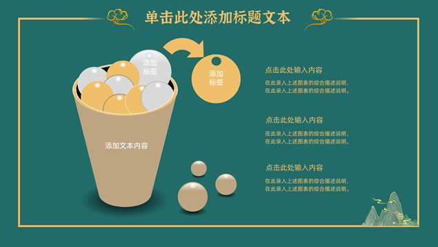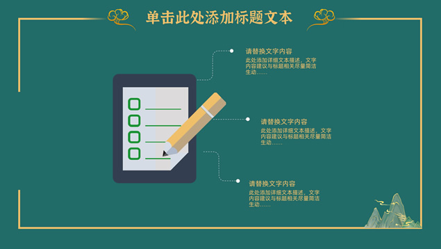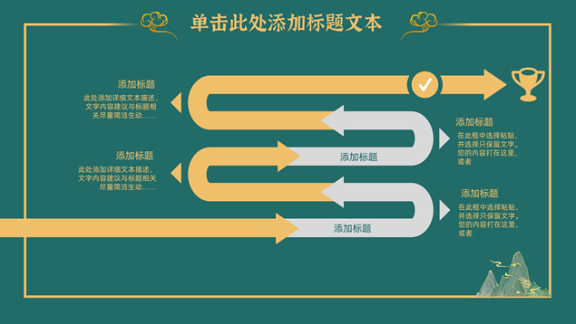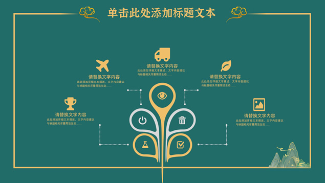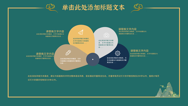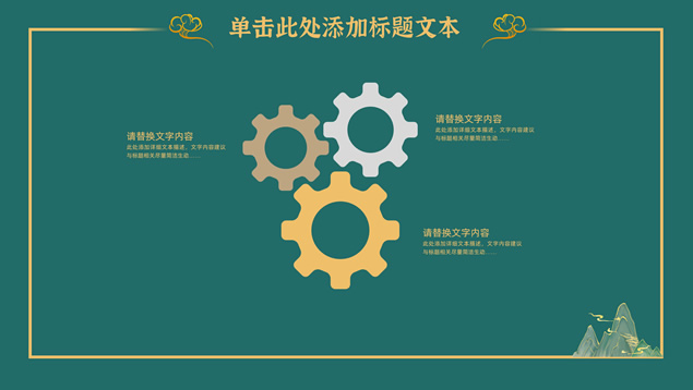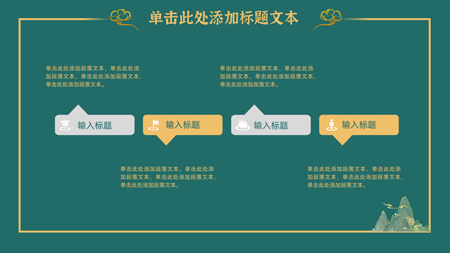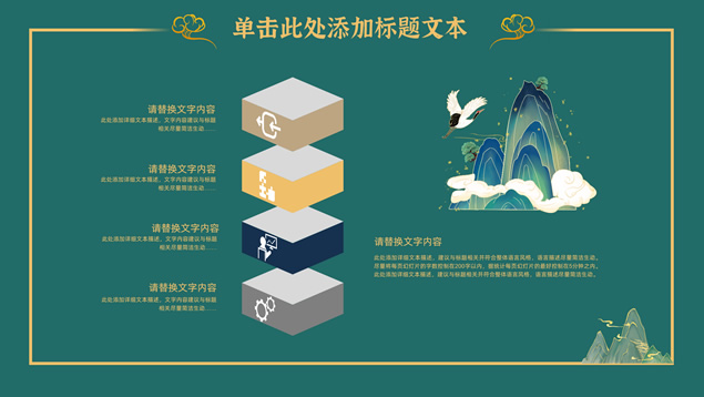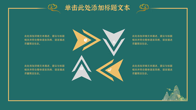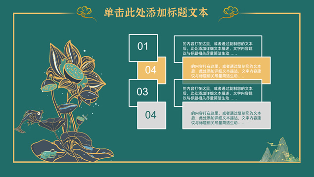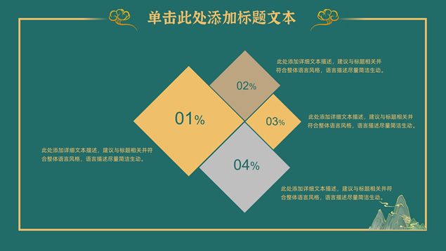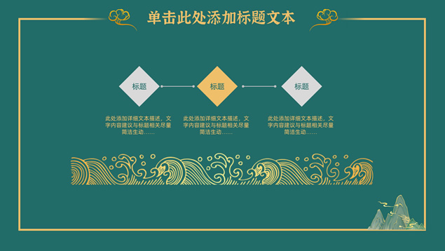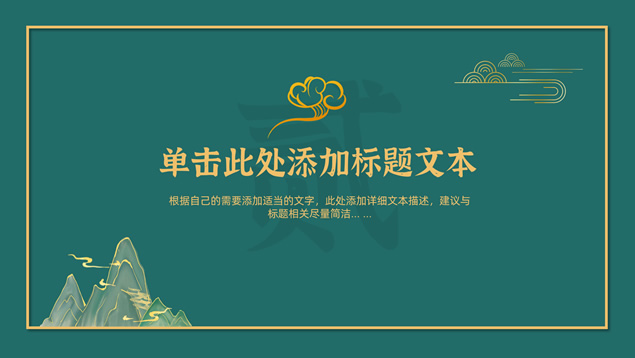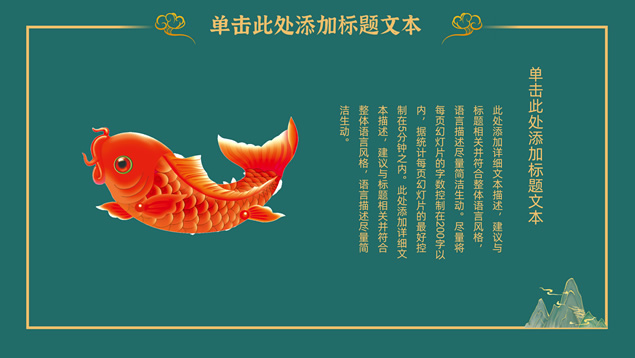 简介:国潮复古简约中国风个人工作汇报ppt模板,本模板共25P,目录:工作评价、自我评价、工作体会、工作规划,墨绿背景,金色祥云、浪花、山峰、树枝、仙鹤、金鱼、莲花、纸扇等中国风元素创意设计,扁平化图表,国潮风版式内容页,适合个人工作总结、工作汇报、个人述职报告等场景应用的国潮中国风ppt模板。