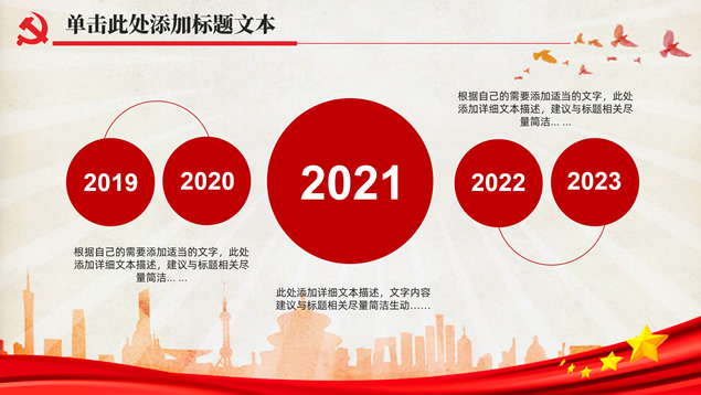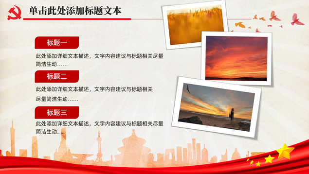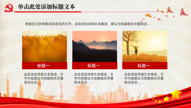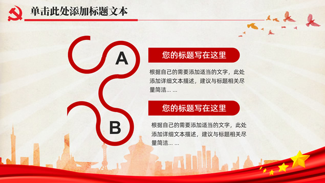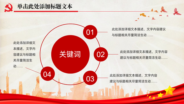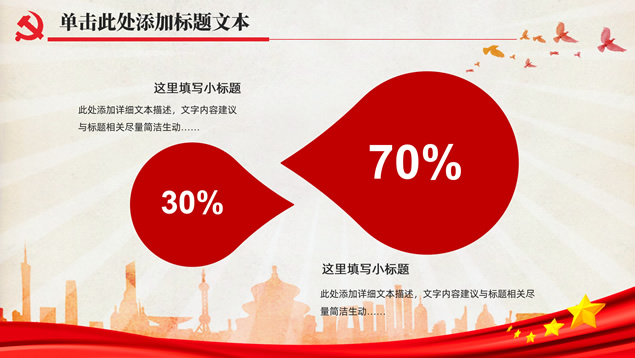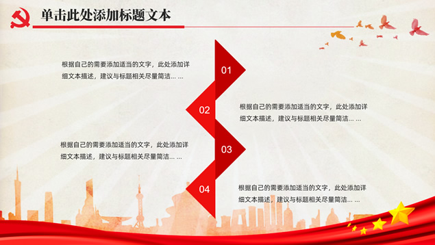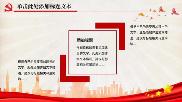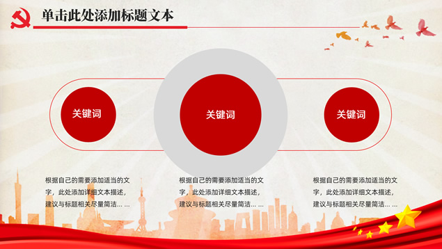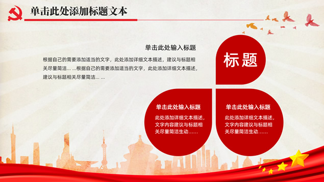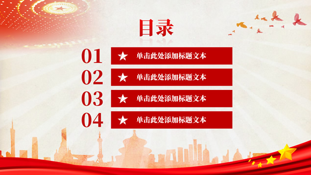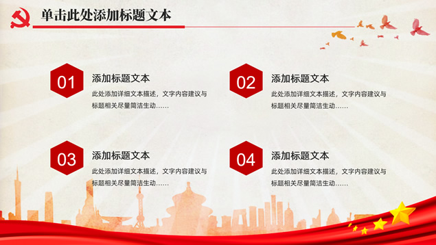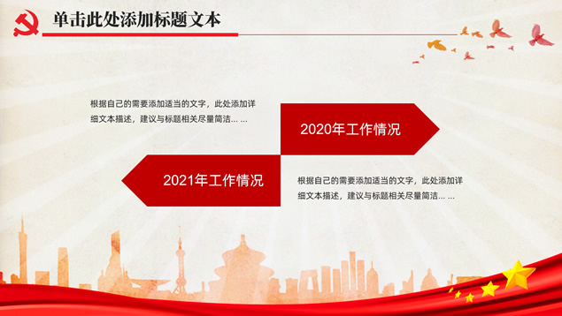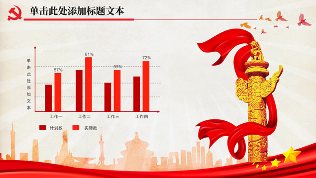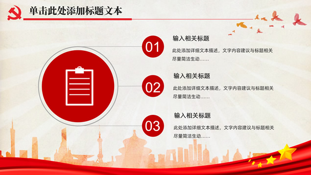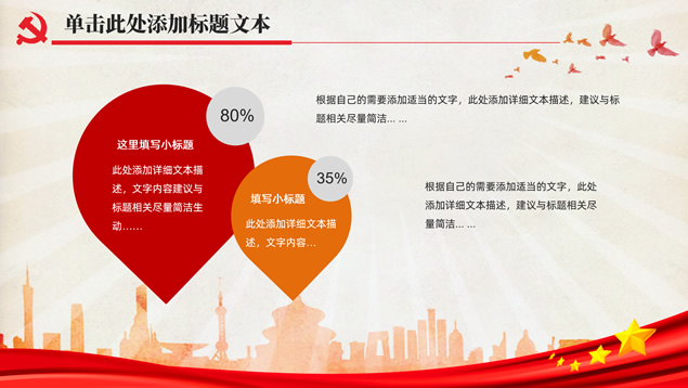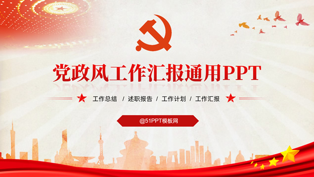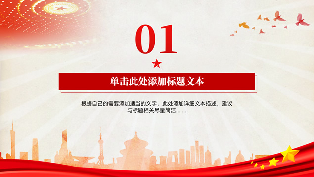 简介:简洁大气实用党政风工作汇报通用ppt模板,本模板共32P,党徽、光芒、和平鸽、人民大会堂顶灯、城市剪影、五角星、红飘带、华表等素材标题文字创意设计封面、目录页、过渡页,庄严红配色,扁平化图表,简约大气版式内容页,适合工作总结、党课心得等场景应用的党政风党建通用ppt模板。