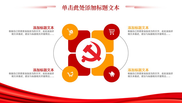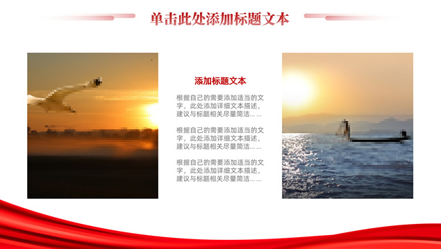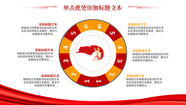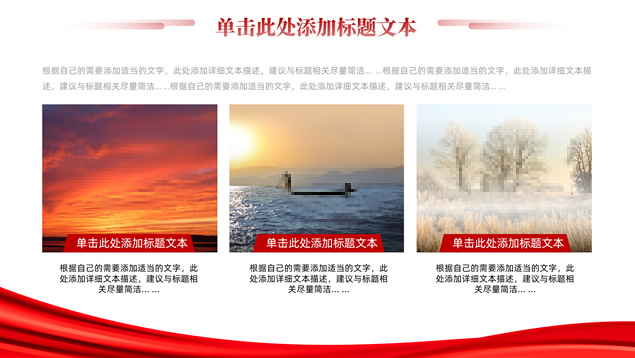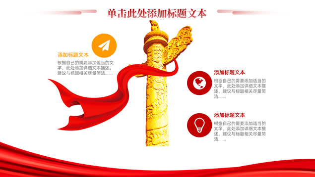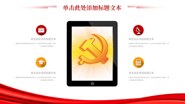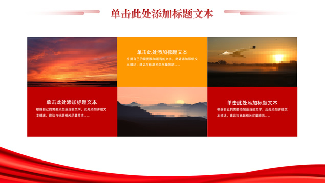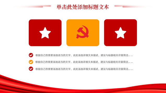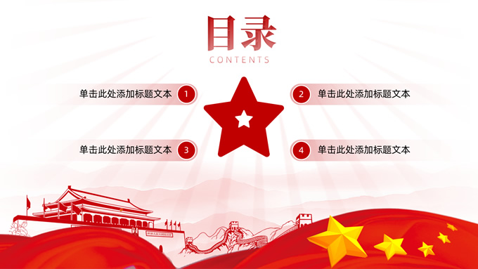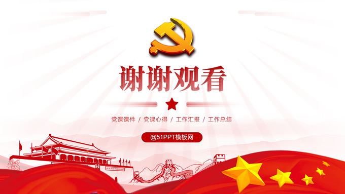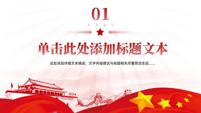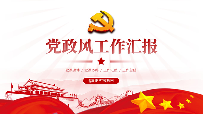 简介:简洁大气实用党政风工作汇报ppt模板,本模板共16P,淡雅红连绵山川背景,金色立体党徽、国旗、天安门、万里长城、五角星、绸带、光芒等党政风元素创意设计封面、目录页、过渡页,庄严红配色,简洁实用党政风版式内容页,适合党课课件、党课心得、党政工作总结汇报等场景应用的党建通用ppt模板。