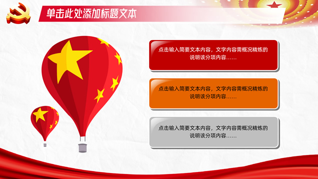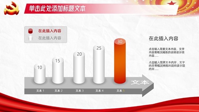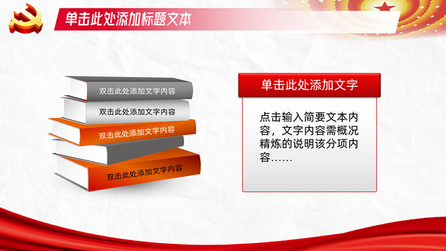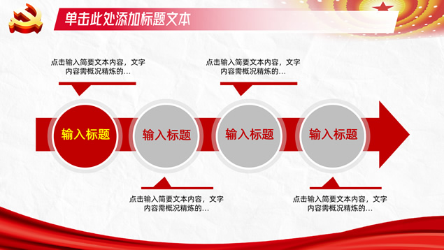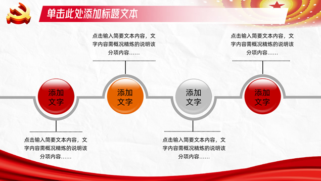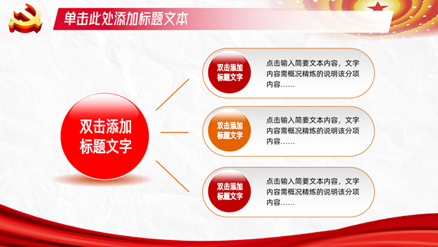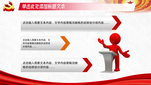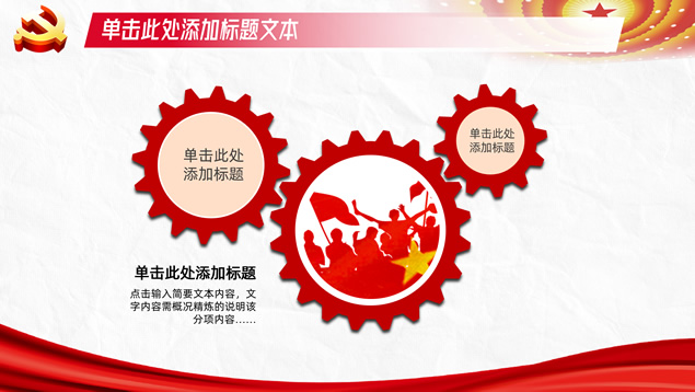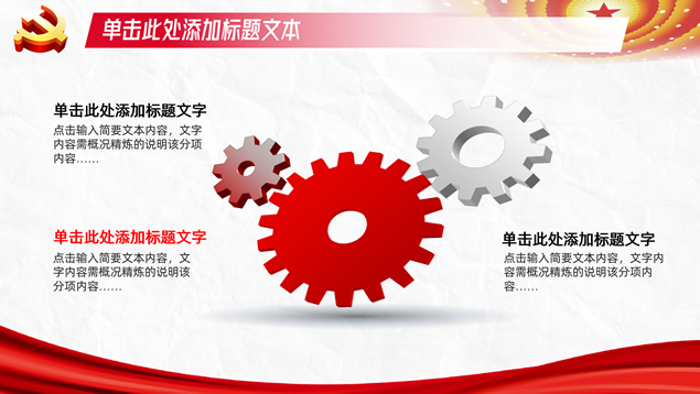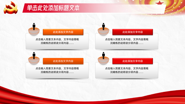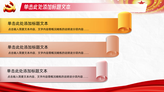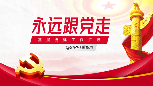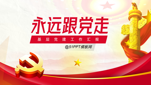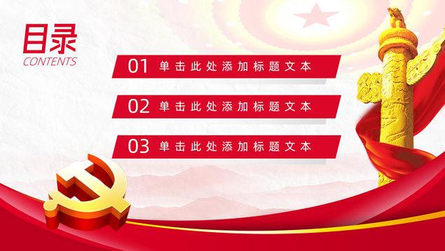 简介:简约庄严党政风基层党建工作汇报ppt模板,本模板共28P,淡雅灰纸张背景,金色立体党徽、华表、绸带、五角星、人民大会堂顶灯元素创意设计封面、目录页、过渡页,庄严红配色,质感图表,适合党课课件、党建工作总结、基层党建工作汇报等场景应用的党政风通用ppt模板。