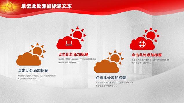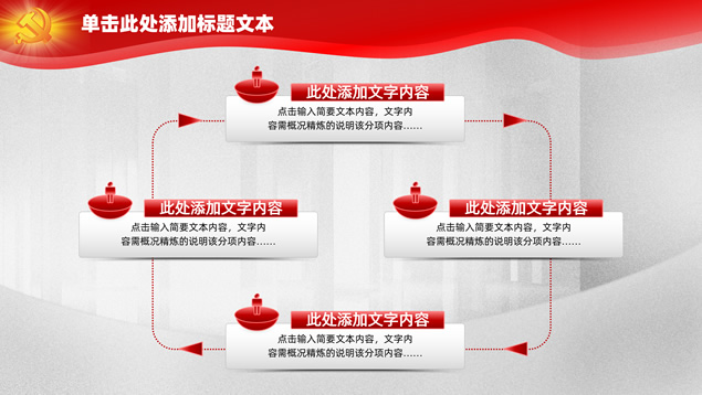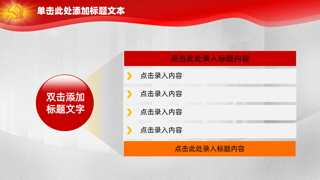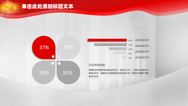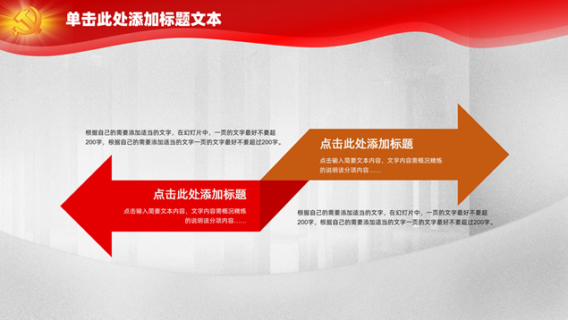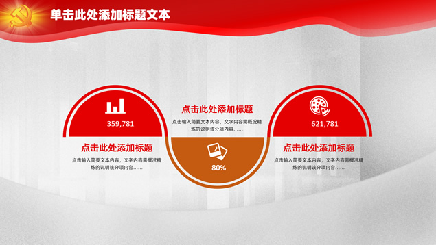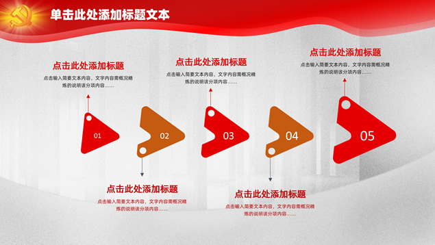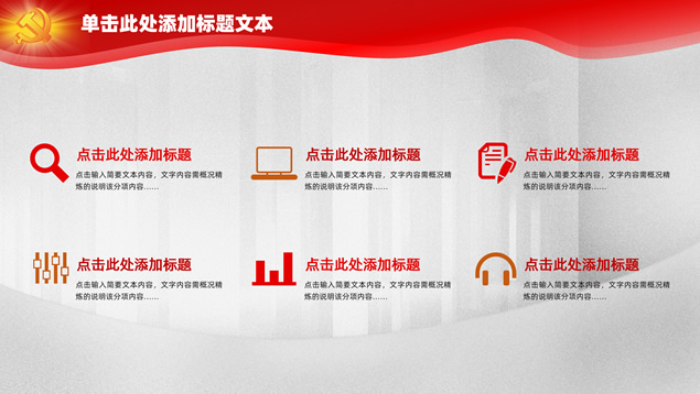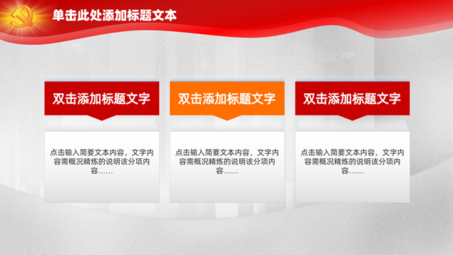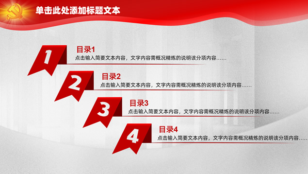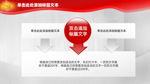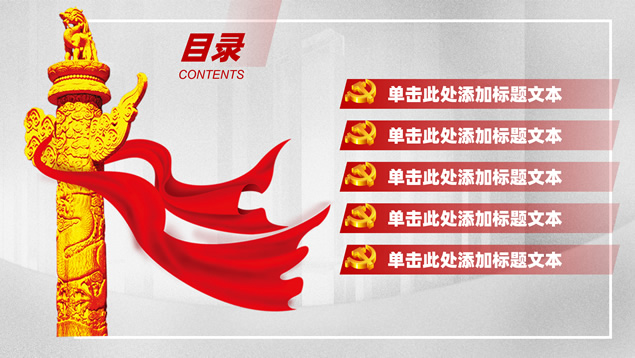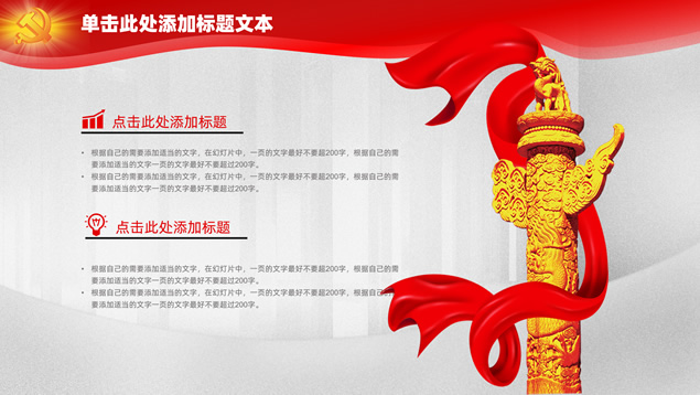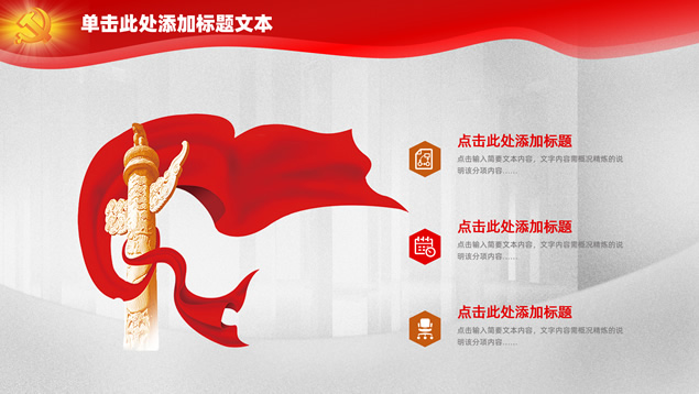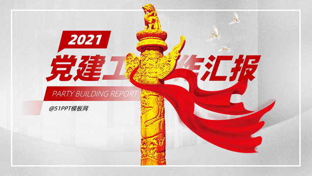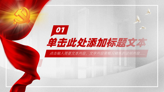 简介:简洁大气党政风党建工作汇报ppt模板,本模板共23P,几何风灰度背景,华表、和平鸽、渐变文字几何图形几何框简洁大气设计封面、目录页、过渡页,庄严红配色,大气质感图表,党建素材配图,适合党建工作汇报、党课课件等场景应用的党政风通用ppt模板。