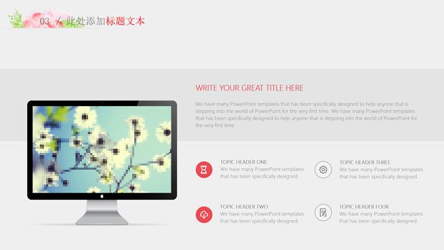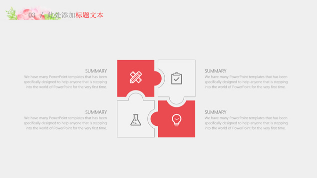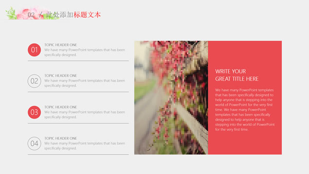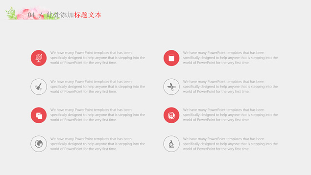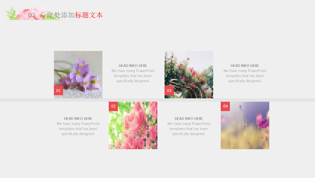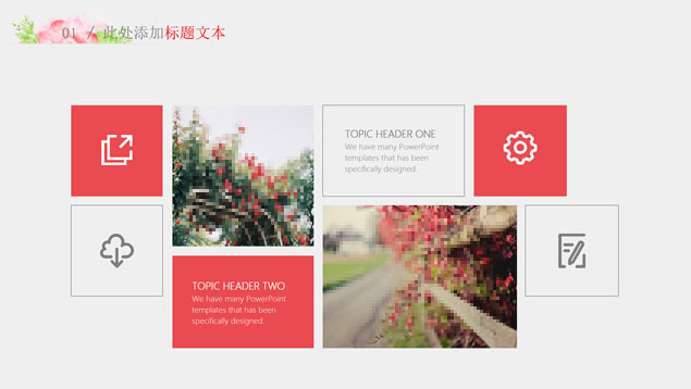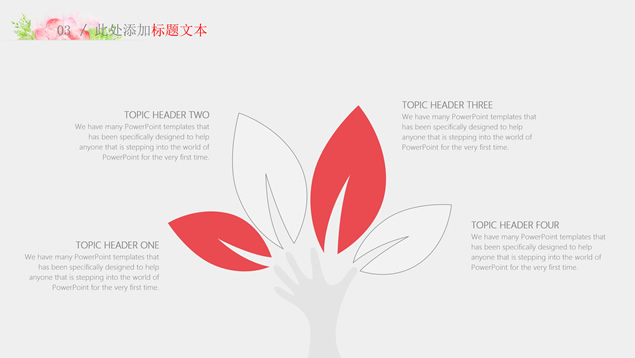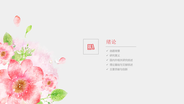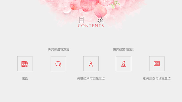 简介:水彩花朵清新文艺风毕业答辩ppt模板,本模板共28P,目录:绪论、研究思路与方法、关键技术与实践难点、研究成果与应用、相关建议与论文总结,淡雅灰纯色背景,水彩植物藤蔓花朵主图创意设计封面、目录页、过渡页,扁平化图表,精美简约图文排版,适合论文答辩、毕业汇报等场景应用的答辩通用ppt模板。