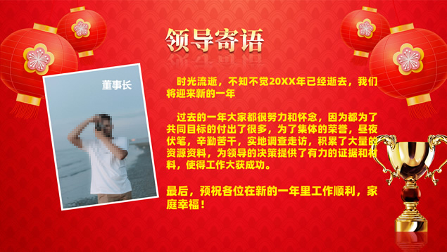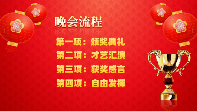 简介:喜庆红公司年会颁奖晚会ppt模板,本模板共11P,目录:领导寄语、颁奖典礼、才艺汇演、获奖感言、自由发挥、企业文化展示宣传,喜庆红动态设计,适合企业年终晚会、颁奖典礼等场景应用的喜庆动态ppt模板。