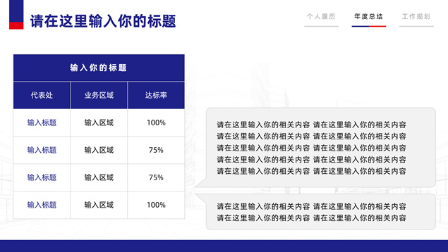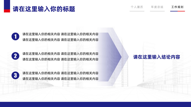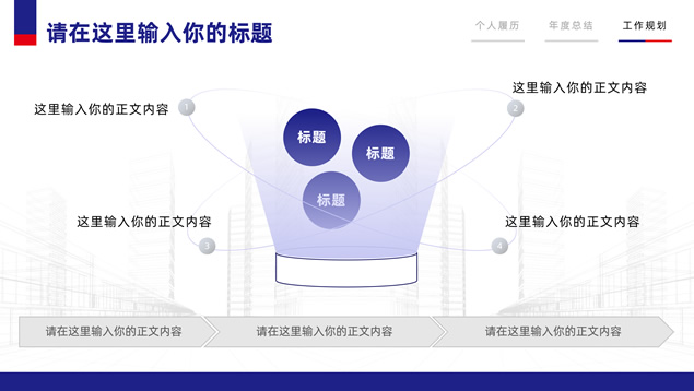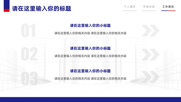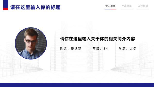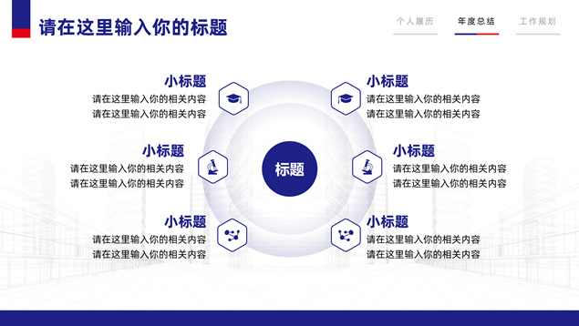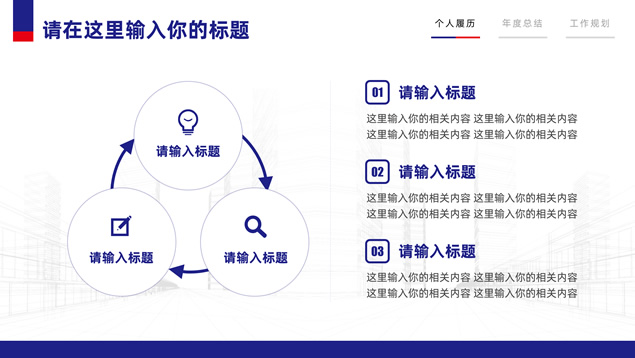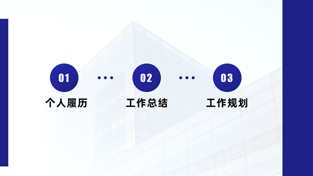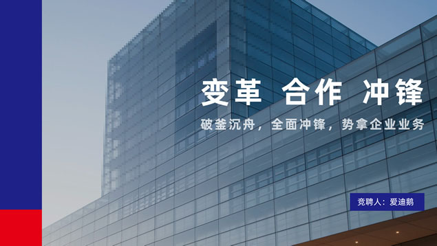 简介:简约大气活力蓝副总经理竞聘报告ppt模板,本模板共20P,目录:个人履历、工作总结、工作规划,商务大楼极简几何风封面、目录页,活力蓝红配色,扁平化图表,适合个人竞聘报告、个人述职报告等场景应用的简约大气活力蓝ppt模板。