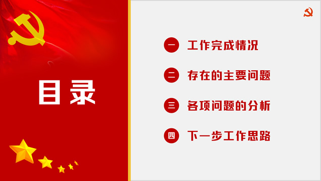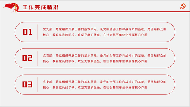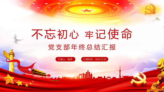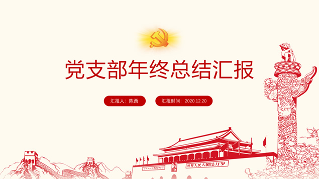 简介:多套风格封面简约党政风年终汇报ppt模板,本模板共8P,金色党徽、党旗、五角星、国旗、华表、天安门、万里长城、人民大会堂顶灯等党政风元素素材配图,简洁设计,庄严红配色,本模板提供3套封面、2套结尾页设计方案,适合年终总结、工作计划等场景应用的党政风主题ppt模板。