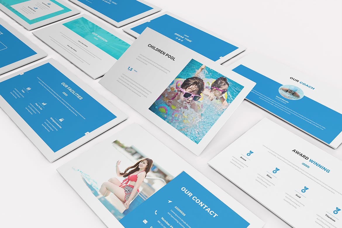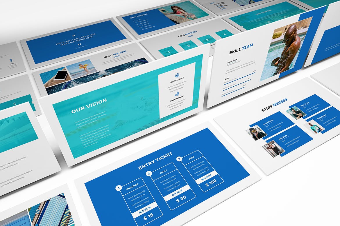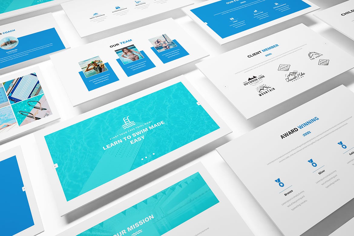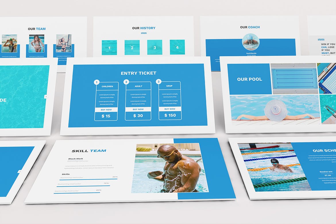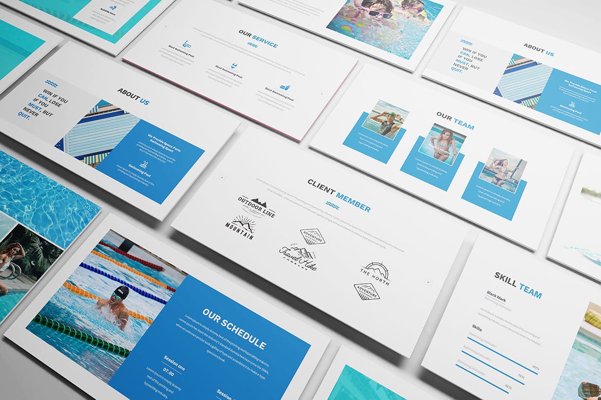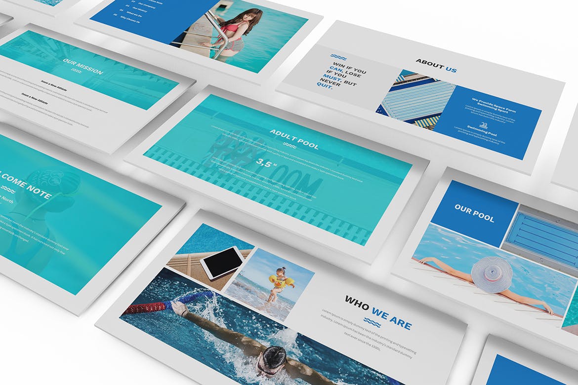 为您的游泳课程和游泳俱乐部游泳Powerpoint演示模板。创意和色调设计使您的游泳展示脱颖而出,简洁,干净,简约的设计理念。用于高质量的业务演示模板