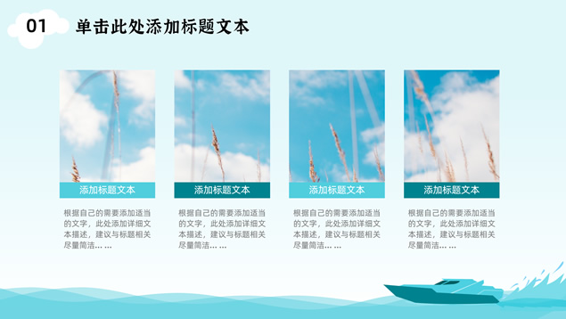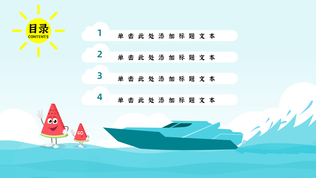 简介:夏日清凉卡通风工作汇报ppt模板,本模板共26P,海浪、快艇、浪花卡通风主图标题文字创意封面、目录页、过渡页,清新蓝配色,简约扁平化图表,适合工作总结、工作汇报、商务述职、个人介绍等场景应用的夏日清凉风商务通用ppt模板。