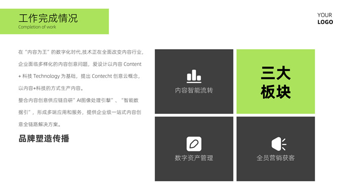 简介:绿灰简约清新风个人总结汇报ppt模板,本模板共20P,目录:工作完成情况、业绩成果展示、工作不足之处、明年工作计划,淡雅灰色山川背景,极简几何条标题文字封面、目录页、过渡页,扁平化图表,简约清新风商务版式内容页,适合工作汇报、工作总结、个人述职等场景应用的商务通用ppt模板。