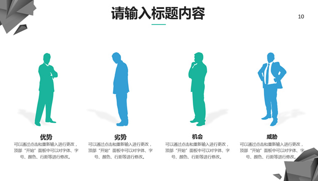 简介:商务大图背景封面,精美时尚图文排版,商务蓝配色,扁平化大气欧美风设计,人物介绍、样机、几何图形裁图等多套图文、图表排版方案,适合商务工作总结报告、年终总结、新年工作计划等场景应用的大气实用商务总结汇报通用ppt模板。