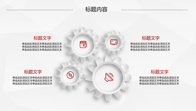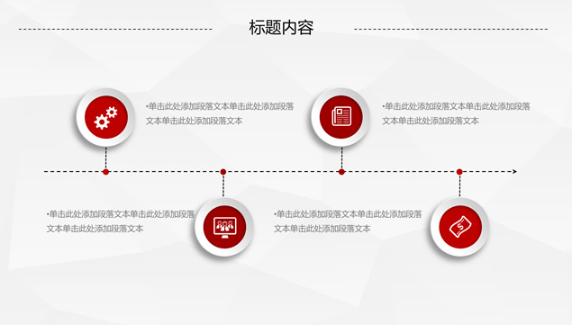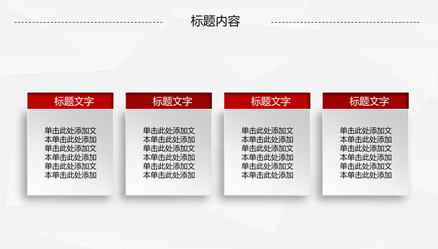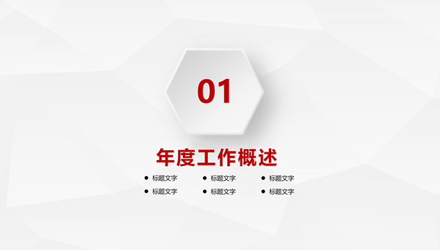 简介:年度工作概述、项目成果展示、工作总结汇报、明年工作计划,淡雅灰低三角形背景,六边形大标题文字创意封面,红灰配色,微立体风格设计,适合年终总结、新年计划等场景应用的红灰微立体商务总结汇报通用ppt模板。