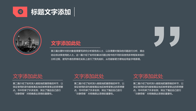 简介:商务大楼背景、几何三角形、标题文字创意封面,几何图形、几何线条设计目录页、过渡页,扁平化大气设计,商务灰配色,精美图表图文排版,适合工作总结、工作汇报、商务演示通用的几何风商务ppt模板。