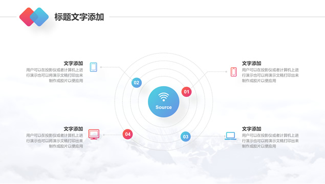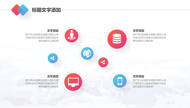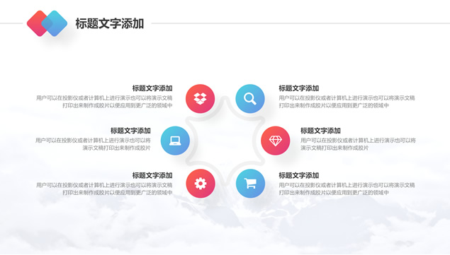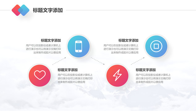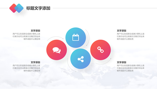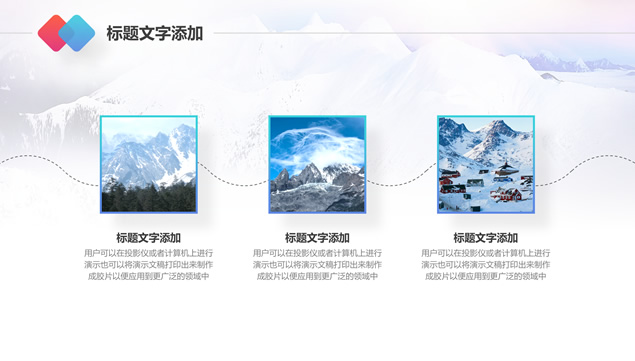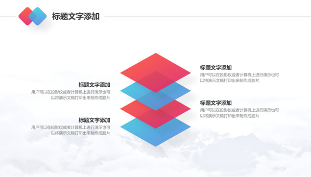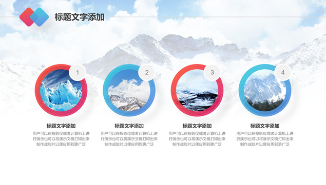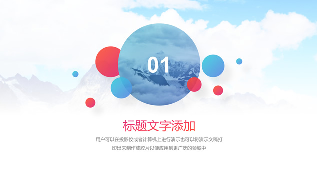 简介:淡雅小清新巍峨雪山背景,红蓝半透明圆极简标题文字创意封面,气泡圆点设计过渡页,红蓝渐变创意配色,微立体阴影风格设计,适合工作汇报、工作总结等场景应用的雪山背景时尚亮丽红蓝商务通用ppt模板。
