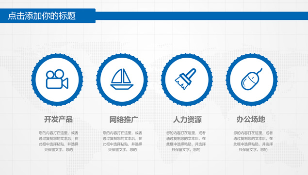 简介:淡雅灰格子世界地图背景、六边形微立体图形、大都市城市剪影创意封面,简约扁平化设计,商务蓝配色,精美图表图文排版,适合工作总结、工作汇报、商业计划、创业计划等场景应用的商务通用ppt模板。