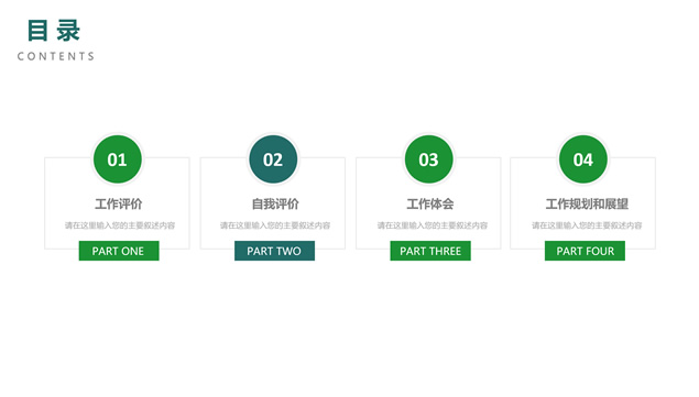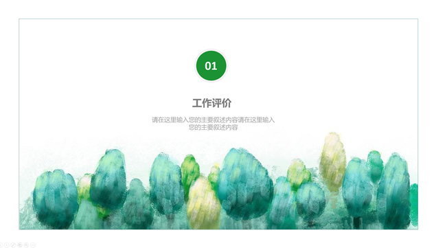 简介:个人总结计划ppt模板,目录:工作评价、自我评价、工作体会、工作规划和展望,水彩风景树主图,细线框极简大标题封面,简约扁平化设计,小清新绿配色,适合个人总结、个人计划的水彩风艺术范ppt模板。