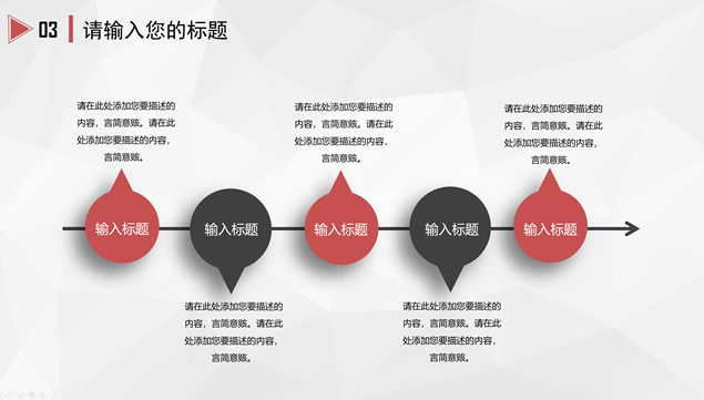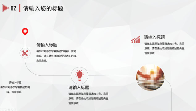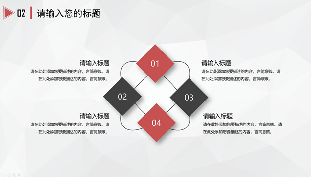 简介:淡雅灰低三角形背景,几何三角形、线条、圆创意封面,简约扁平化设计,商务红灰配色,适合商务工作汇报、工作总结的淡雅灰低三角形背景几何图形线条创意简约商务风ppt模板。