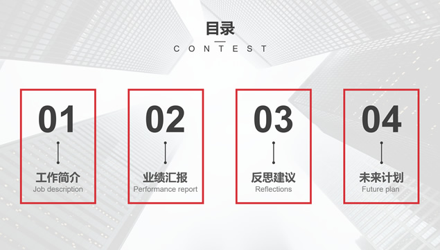 简介:红灰商务工作总结报告ppt模板,目录:工作简介,业绩汇报,反思建议,未来计划,置灰商务大图背景,渐变红几何图形线条创意封面,大气扁平化设计,红灰商务配色,多场景应用的图表,精美图文排版,适合商务工作汇报、工作总结报告的大气红灰商务风ppt模板。