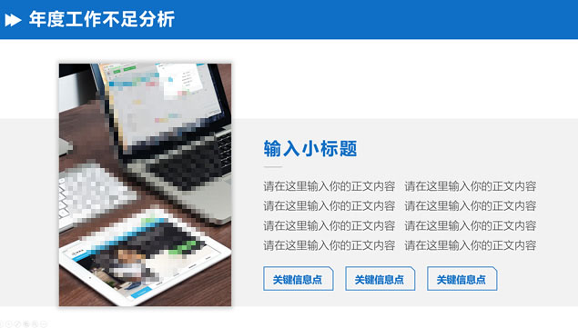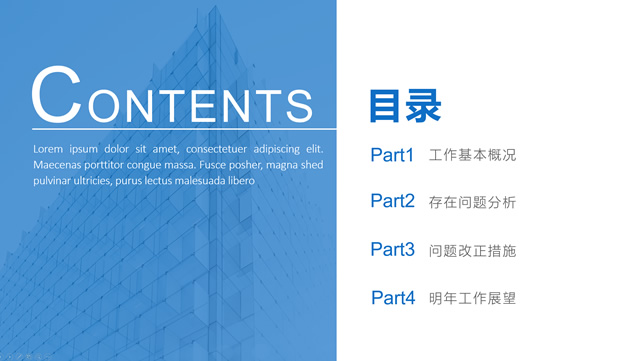 简介:工作总结计划通用ppt模板,工作基本概况,存在问题分析,问题改正措施,明年工作展望,几何图形裁图创意封面过渡页,商务蓝配色,扁平化大气设计,多场景应用的丰富商务图表,适合商务工作总结、工作计划等场景应用的通用商务ppt模板。