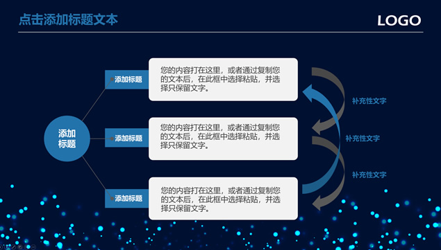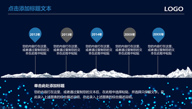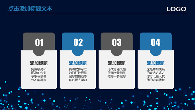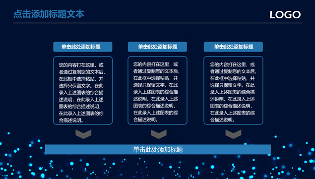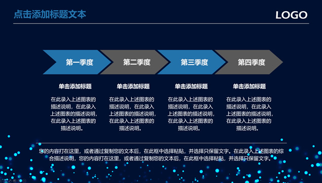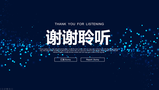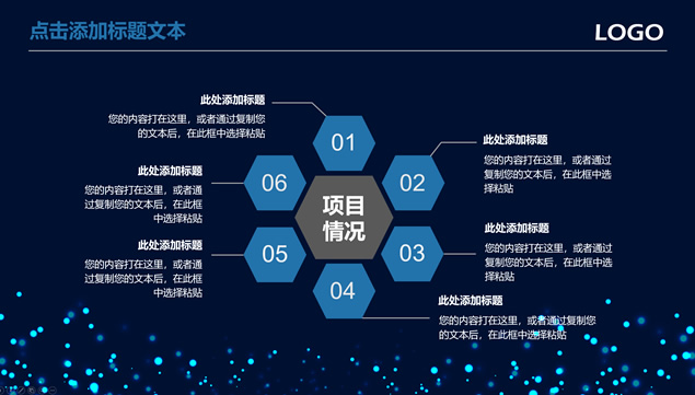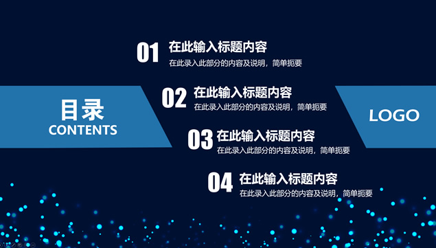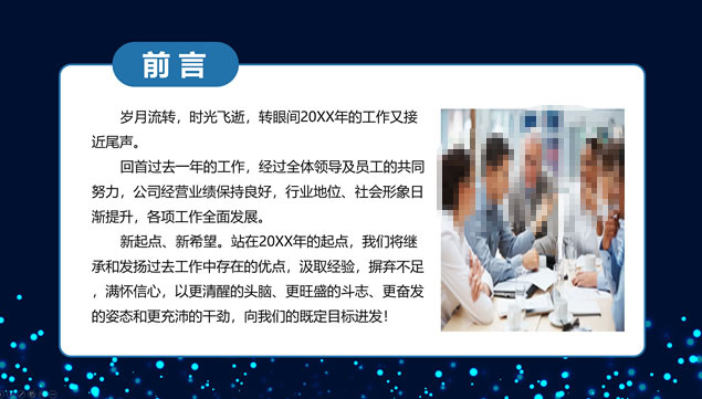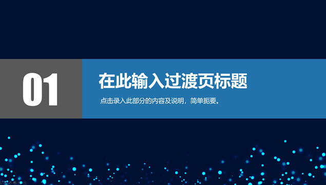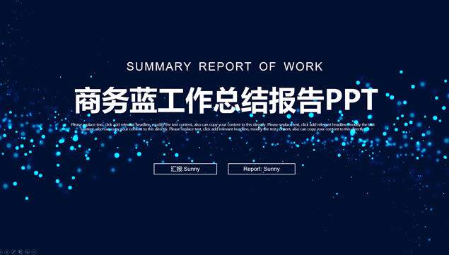 简介:唯美亮蓝粒子光斑背景,极简文字大气封面,蓝灰商务配色,扁平化设计,精美实用图表,适合商务工作汇报、工作总结报告、项目介绍等场景应用的唯美粒子光斑背景商务蓝通用ppt模板。