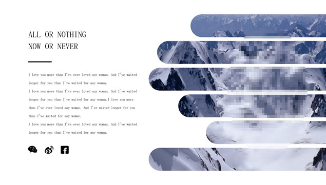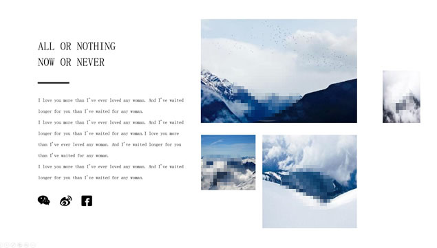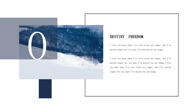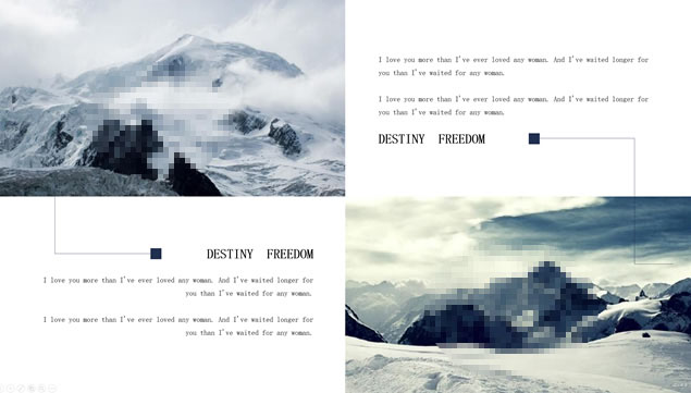 简介:大气雪山大图背景封面、斜线条、细线框创意封面,简约扁平化设计,多套精美图文排版方案,时尚大气风简约商务汇报通用ppt模板。
