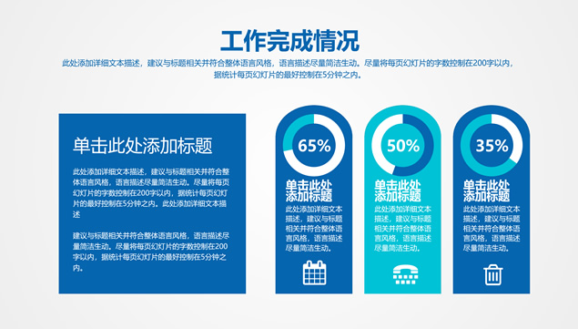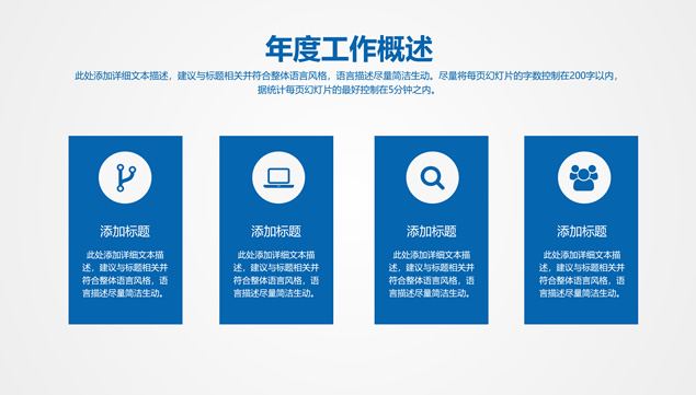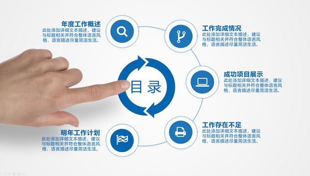 简介:工作总结计划ppt模板,年度工作概述,工作完成情况,成功项目展示,工作存在不足,明年工作计划,蓝色海洋背景,几何图形线条创意封面,精美商务图片配图,扁平化图表,适合年终总结暨新年工作计划的精美实用商务蓝ppt模板。