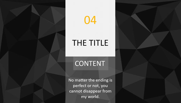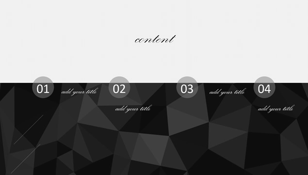 简介:黑灰低三角形背景,半透明创意设计,精美图文排版,半透明排版,适合商务工作汇报、工作总结报告的黑色低多边形背景半透明图表扁平化ppt模板。