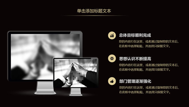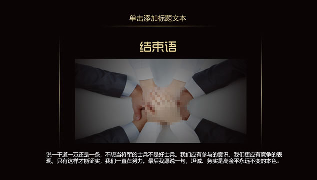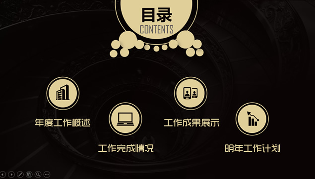 简介:年终总结明年工作计划ppt模板,目录:年度工作概述,工作完成情况,工作成果展示,明年工作计划,黑金尊贵配色,极简大气设计,高端风格排版,适合年终工作总结、明年工作计划的通用商务ppt模板。