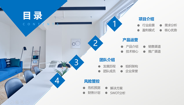 简介:商务会议室大图,半透明几何图形创意封面,简约扁平化设计,精美图文排版,适合项目介绍,产品运营,团队介绍,风险管控等场景应用的大图排版扁平风蓝色商务工作汇报通用ppt模板。