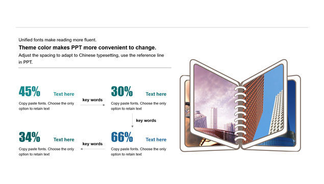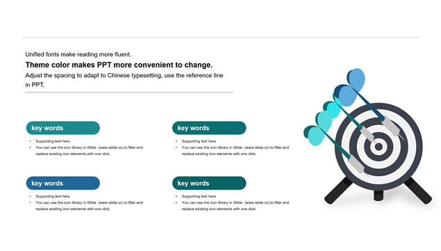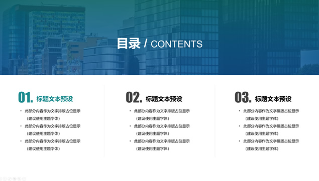 简介:蓝绿渐变配色,现代商务大楼大图背景,极简纯文字创意封面,简约扁平化设计,精美卡通商务图标(相册、箭靶、电脑),适合工作总结、工作汇报的通用大气商务ppt模板。