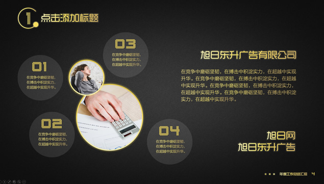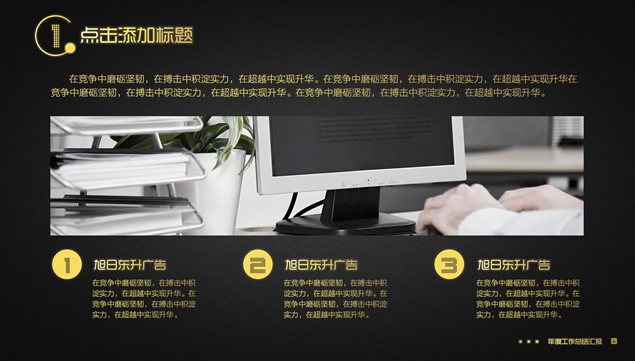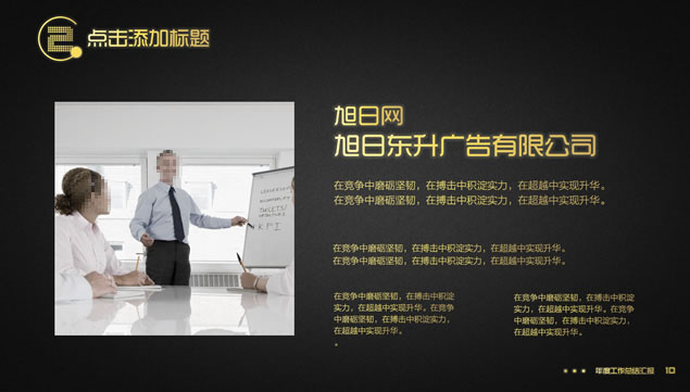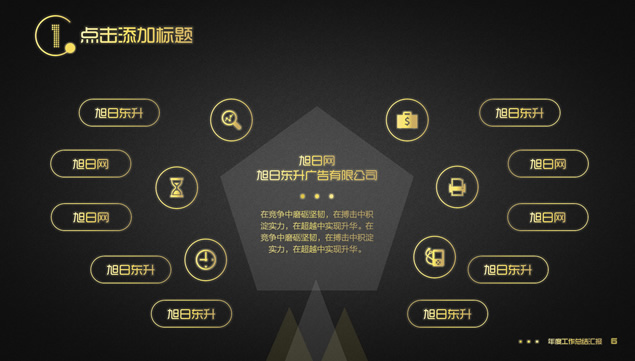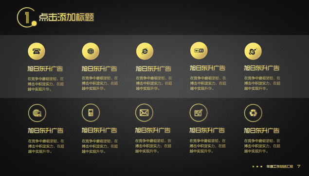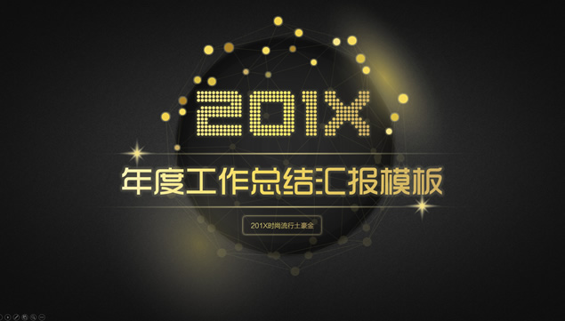 简介:质感黑磨砂背景,地球点线网创意,像素点数字序号,金色图表、金色字体,黑金配色,大气高端时尚简约设计,适合商务工作总结、工作汇报通用的ppt模板。