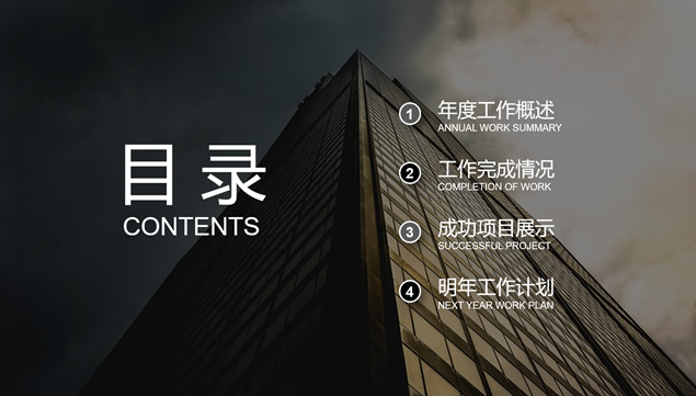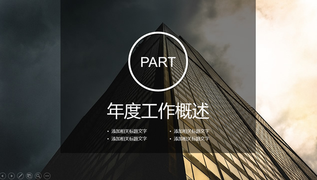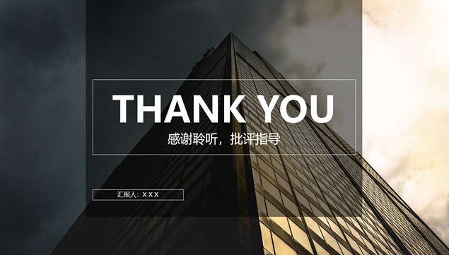 简介:仰视商务大楼大图封面背景,半透明矩形、细线线条框极简约设计,商务黑灰配色,简约扁平化风格,适合商务工作总结报告、工作汇报的通用ppt模板。