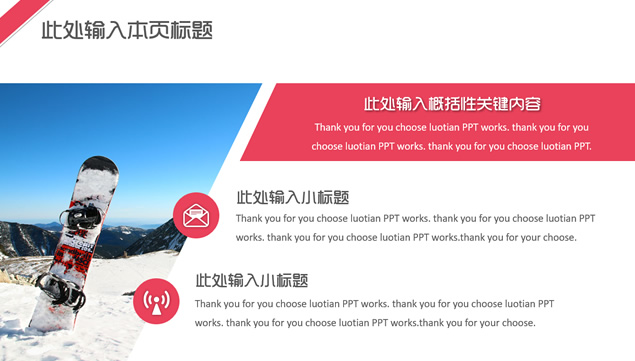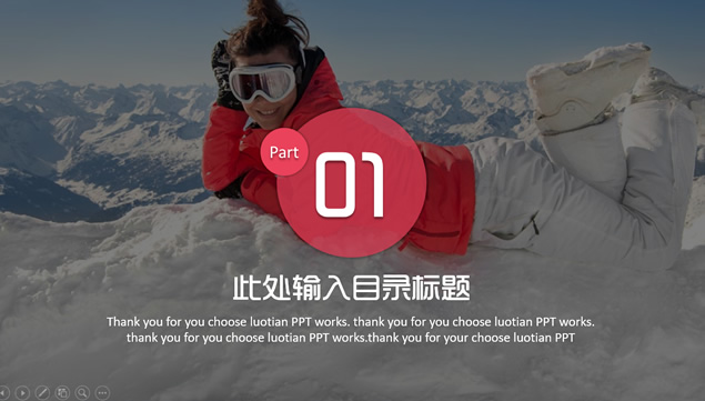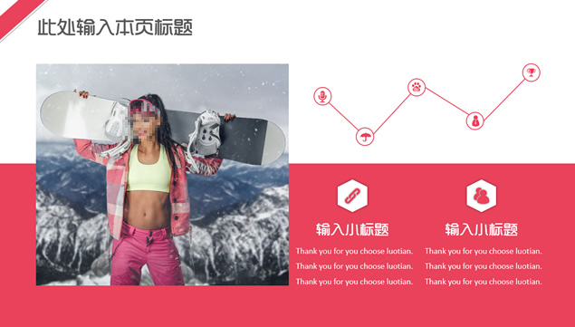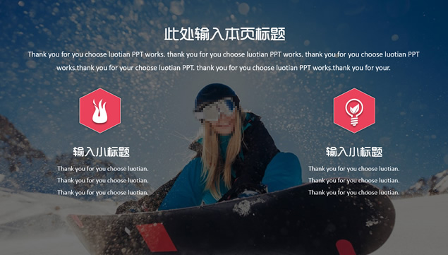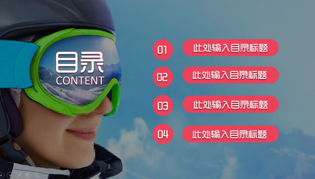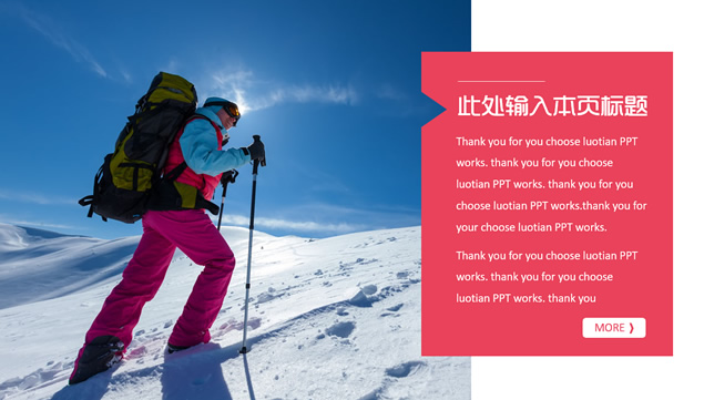 简介:滑雪、雪山等雪地运动主题大图,激情活力配色,精美大图排版,适合雪地运动主题运动项目、运动场地、运动器械介绍等场景应用,雪地运动主题雪元素商务演示通用ppt模板。