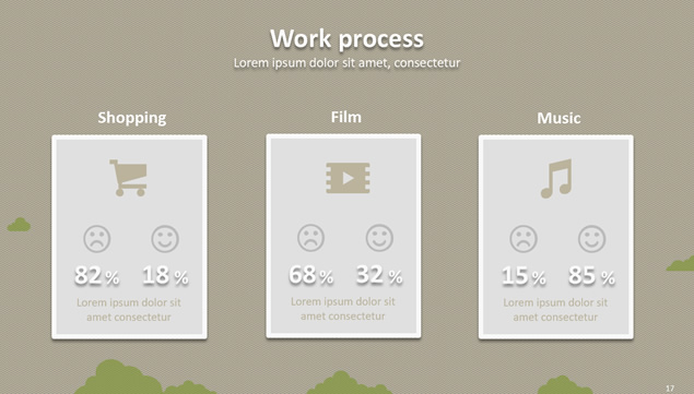 简介:5套不同底纹图案,5种不同配色方案,矢量卡通小清新,图片及图表阴影效果精美排版,5种底纹及配色方案卡通小清新通用商务总结汇报ppt模板,5套模板打包下载。