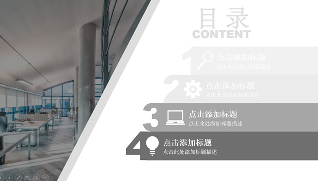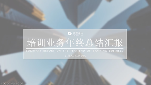 简介:模糊处理仰视视觉商务高楼封面背景,半透明矩形标题文本框,商务图片与超大数字设计过渡页,不同灰度经典商务灰图表,适合公司培训部年终总结汇报ppt模板。