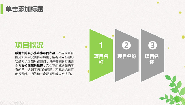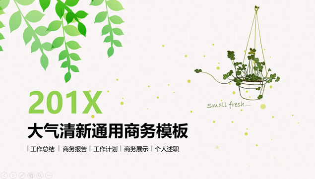 简介:矢量卡通绿叶 藤蔓 花篮,绿灰配色扁平化图表,绿色小清新大气简约通用商务工作汇报ppt模板。