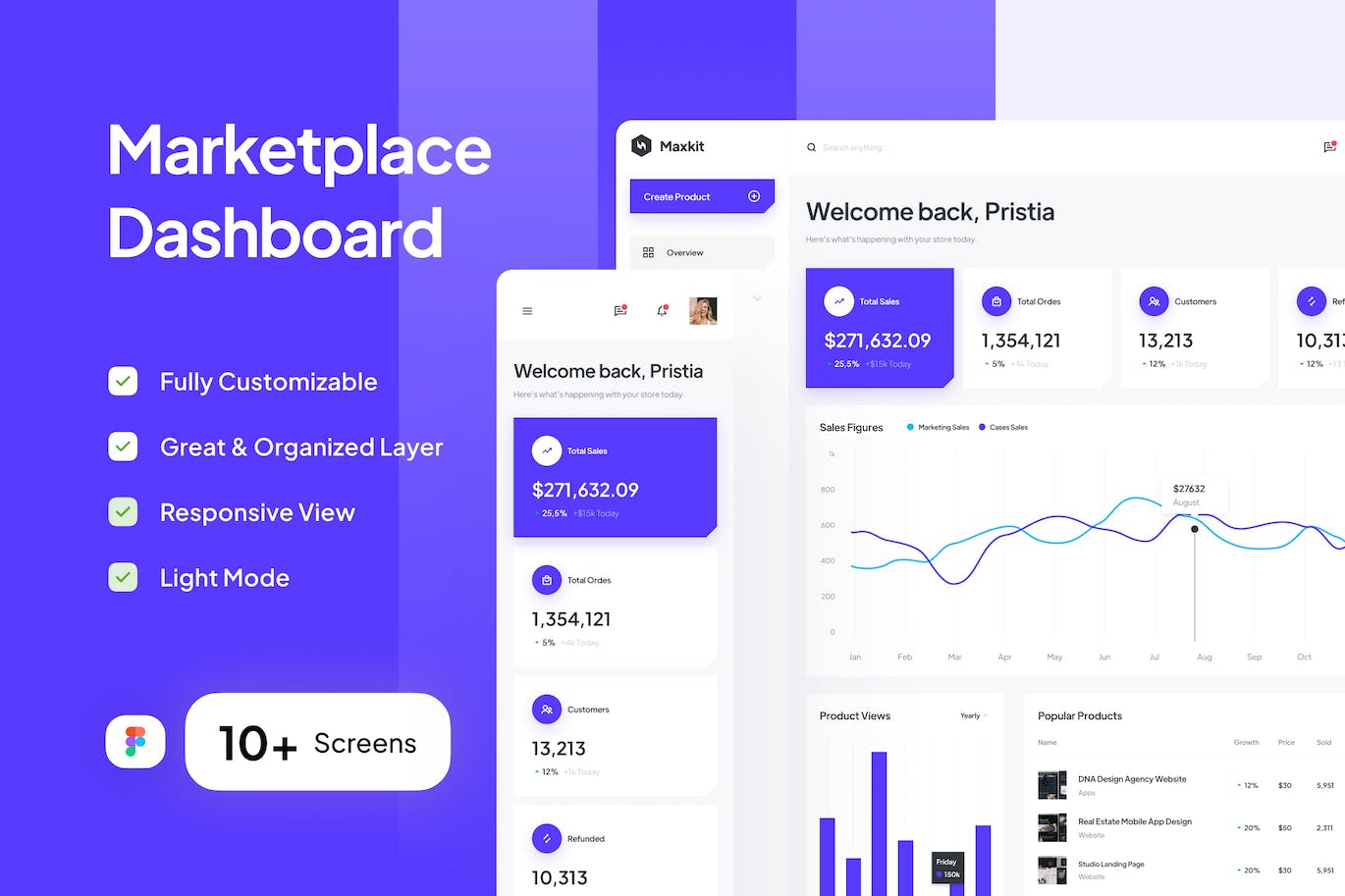 Maxkit是一款市场UI套件仪表板,具有简洁、简约、现代的设计和响应性强的视图。Maxkit UI套件适合您,易于完全定制以满足您的需求。在灯光模式下可用,在Figma中易于使用。