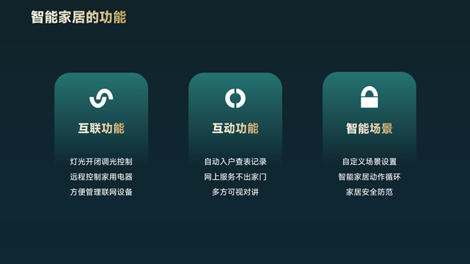 简介:绿金色清新智能家居产品培训ppt模板,本模板共11P,涵盖了封面页、目录页、过渡页、逻辑图示页、内容页、图表页等几种版式,主要创作的灵感来源于米家等智能家居APP,利用绿金色为主的渐变色作为主色调,给使用者舒适、居家的感觉,同时也具备科技、智能的特点,适合用于产品内部培训、业务介绍等场合,P界达人 殷杰 作品。